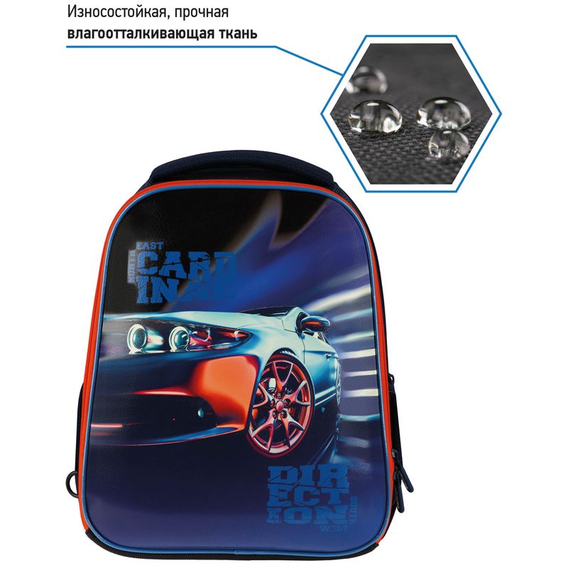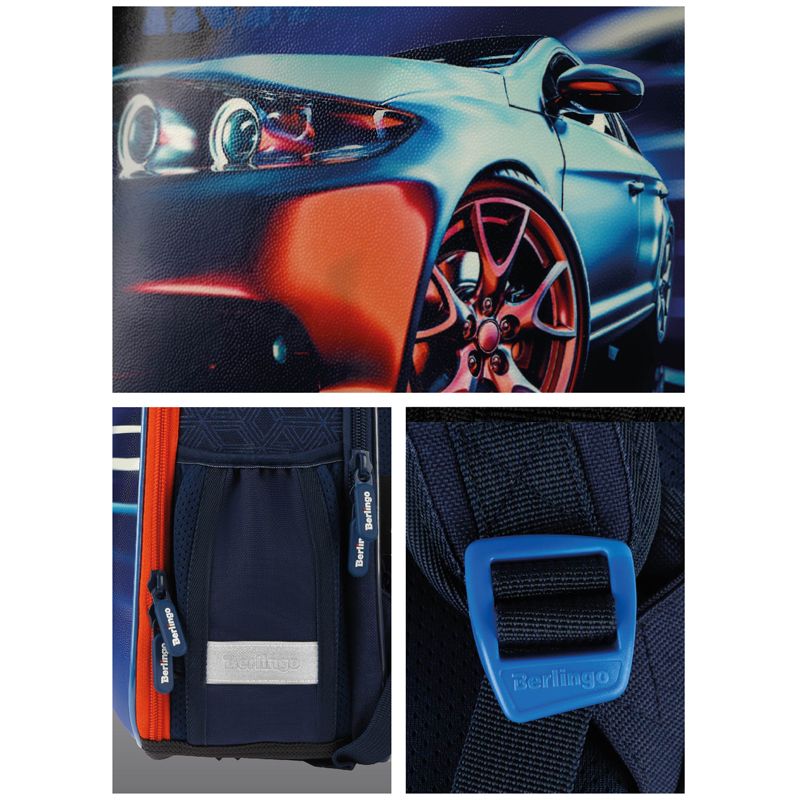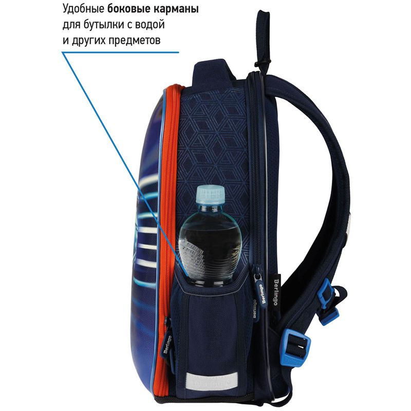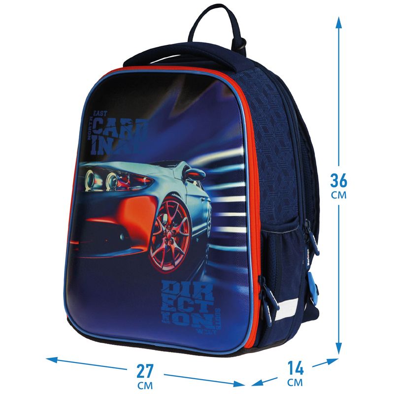 Ранец объёмом 13,5 литров имеет 2 отделения, одно из которых расположено у спинки и предназначено для учебных пособий формата А4+, 2 боковых кармана на резинке, на спинке потайной карман на молнии. Внутри предусмотрены разделители для учебных пособий и именная карточка для подписи.
