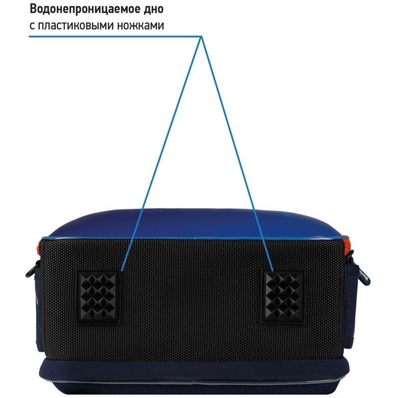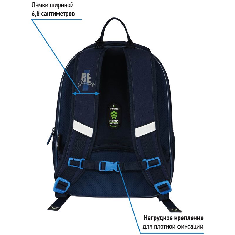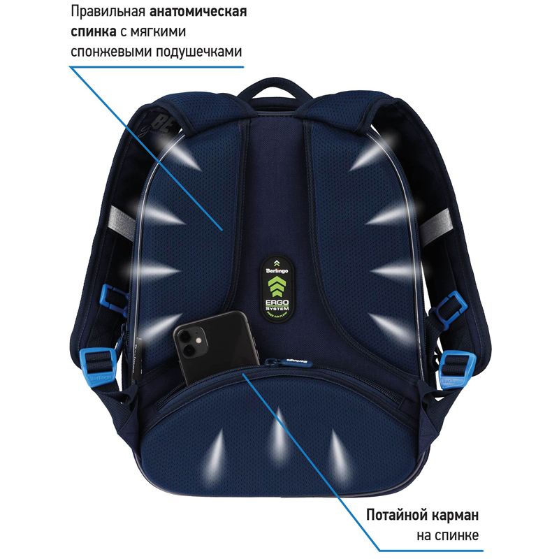 Благодаря анатомической вентилируемой спинке, регулируемым по длине лямкам, а также нагрудному креплению ранец плотно фиксируется на спине ребенка, что помогает равномерно распределить нагрузку и сохранить правильную осанку. Уплотненная мягкая ручка и петля для подвешивания к парте делают ранец очень удобным. Дно выполнено из водонепроницаемого материала с пластиковыми ножками для защиты от влаги. Световозвращающие элементы на лямках, передней и боковых частях ранца обеспечивают безопасность ребенка в темное время суток. Мешок для обуви в комплекте, предусмотрено крепление мешка к ранцу с помощью специальных фиксаторов. Вес менее 1 кг.