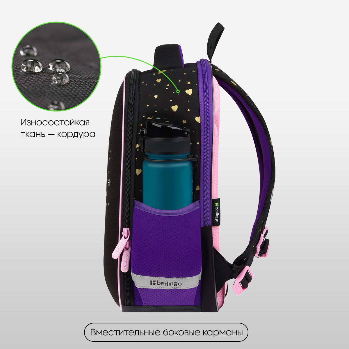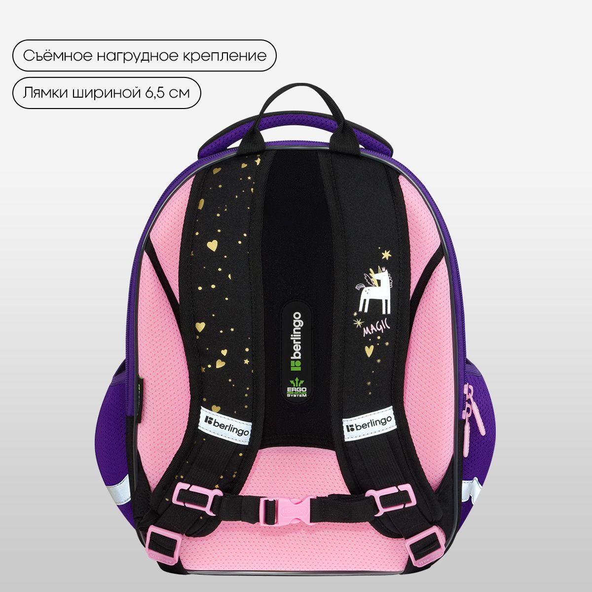 Благодаря анатомической вентилируемой спинке, регулируемым по длине лямкам, а также нагрудному креплению ранец плотно фиксируется на спине ребенка, что помогает равномерно распределить нагрузку и сохранить правильную осанку. Уплотненная мягкая ручка и петля для подвешивания к парте делают ранец очень удобным. Дно выполнено из водонепроницаемого материала для надежной защиты от влаги. Световозвращающие элементы на лямках, передней и боковых частях ранца обеспечивают безопасность ребенка в темное время суток.