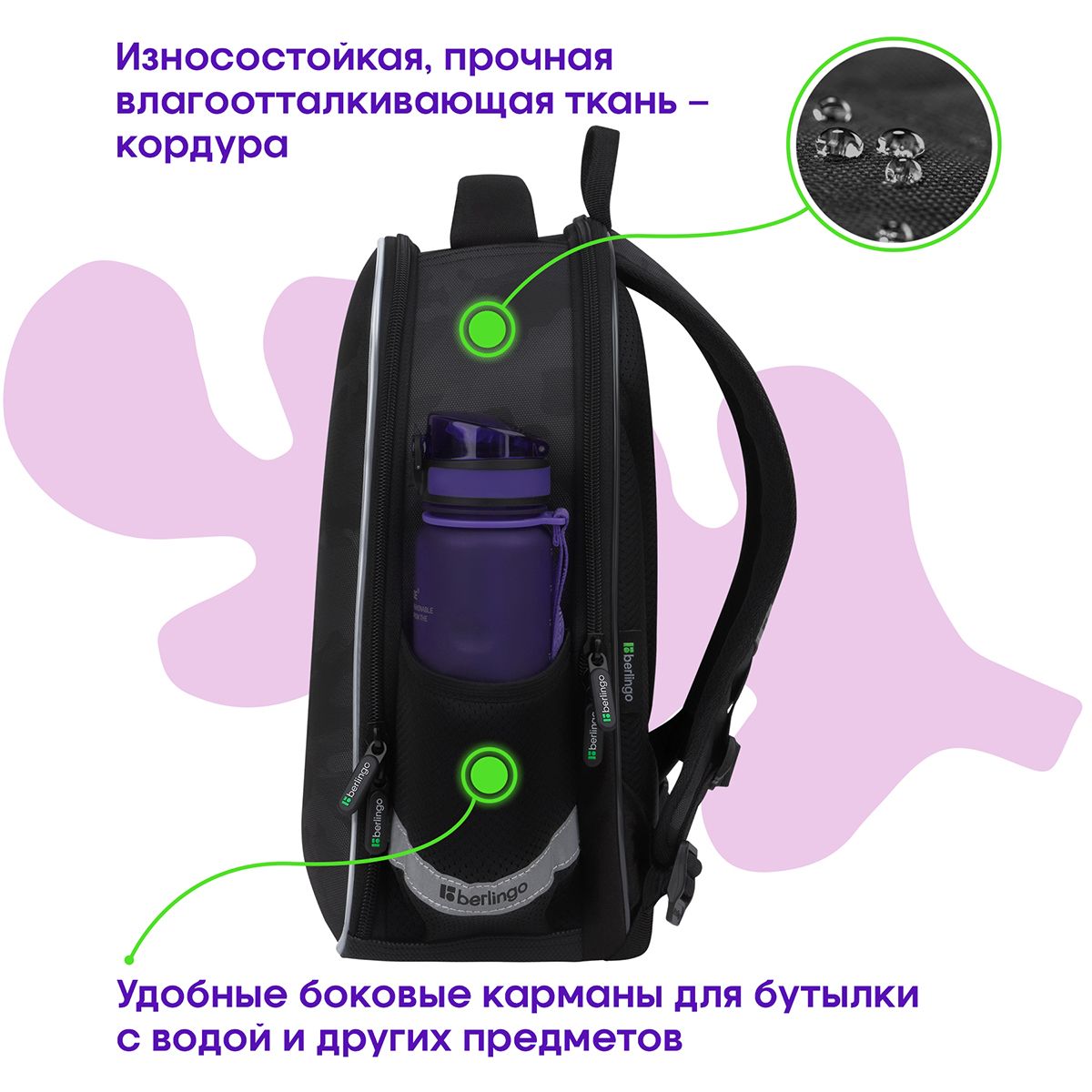 Благодаря анатомической вентилируемой спинке, регулируемым по длине лямкам, а также нагрудному креплению ранец плотно фиксируется на спине ребенка, что помогает равномерно распределить нагрузку и сохранить правильную осанку. Уплотненная мягкая ручка и петля для подвешивания к парте делают ранец очень удобным. Дно выполнено из водонепроницаемого материала для надежной защиты от влаги. Световозвращающие элементы на лямках, передней и боковых частях ранца обеспечивают безопасность ребенка в темное время суток.