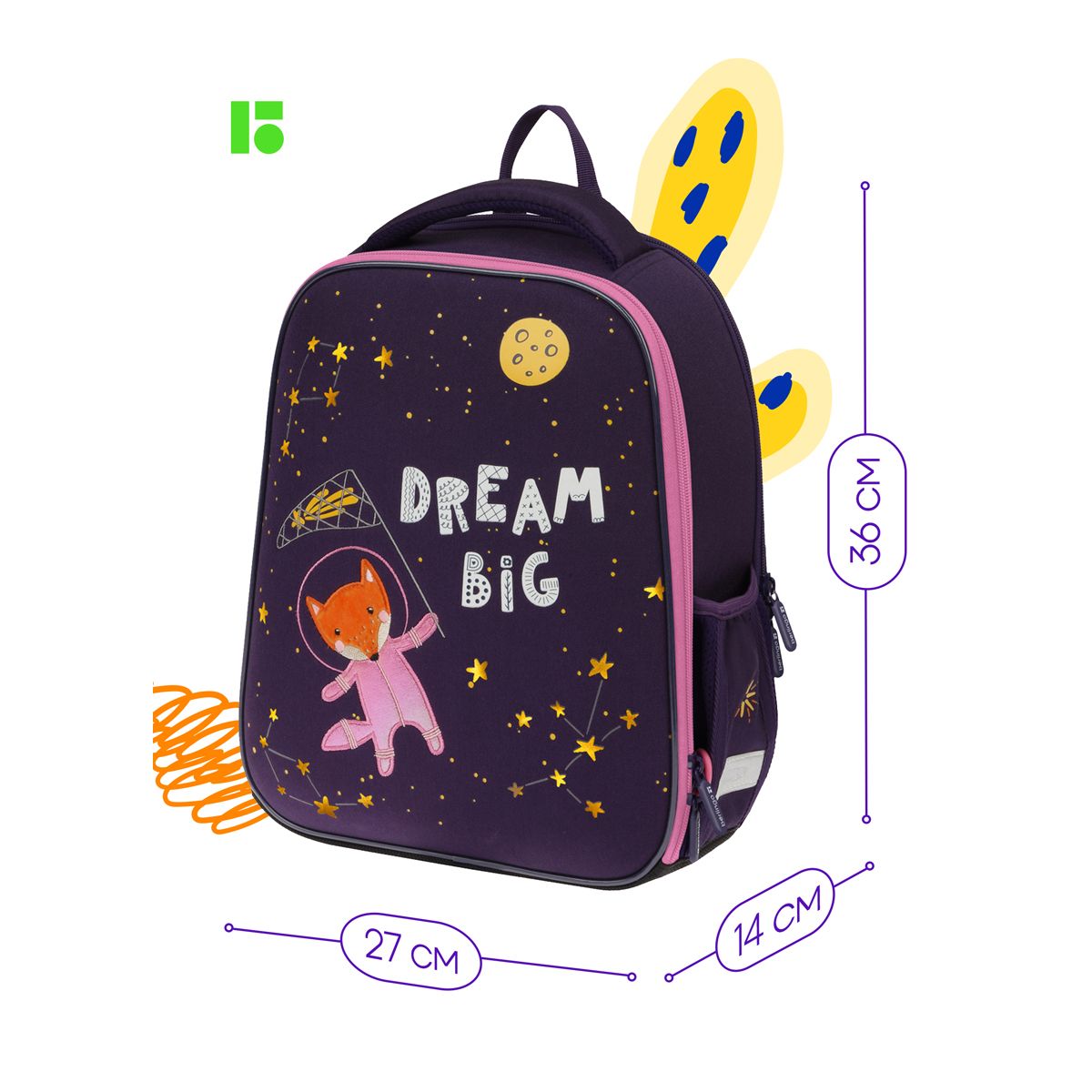 Ранец объёмом 13,5 литров имеет 2 отделения, одно из которых расположено у спинки и предназначено для учебных пособий формата А4+, 2 боковых кармана на резинке. Внутри предусмотрены разделители для учебных пособий и именная карточка для подписи.