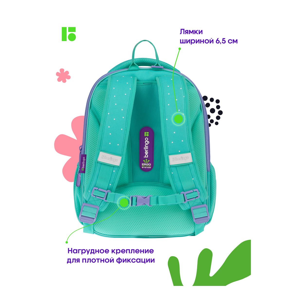 Благодаря анатомической вентилируемой спинке, регулируемым по длине лямкам, а также нагрудному креплению ранец плотно фиксируется на спине ребенка, что помогает равномерно распределить нагрузку и сохранить правильную осанку. Уплотненная мягкая ручка и петля для подвешивания к парте делают ранец очень удобным. Дно выполнено из водонепроницаемого материала с пластиковыми ножками для защиты от влаги. Световозвращающие элементы на лямках, передней и боковых частях ранца обеспечивают безопасность ребенка в темное время суток. Мешок для обуви в комплекте, предусмотрено крепление мешка к ранцу с помощью специальных фиксаторов. Вес менее 1 кг.