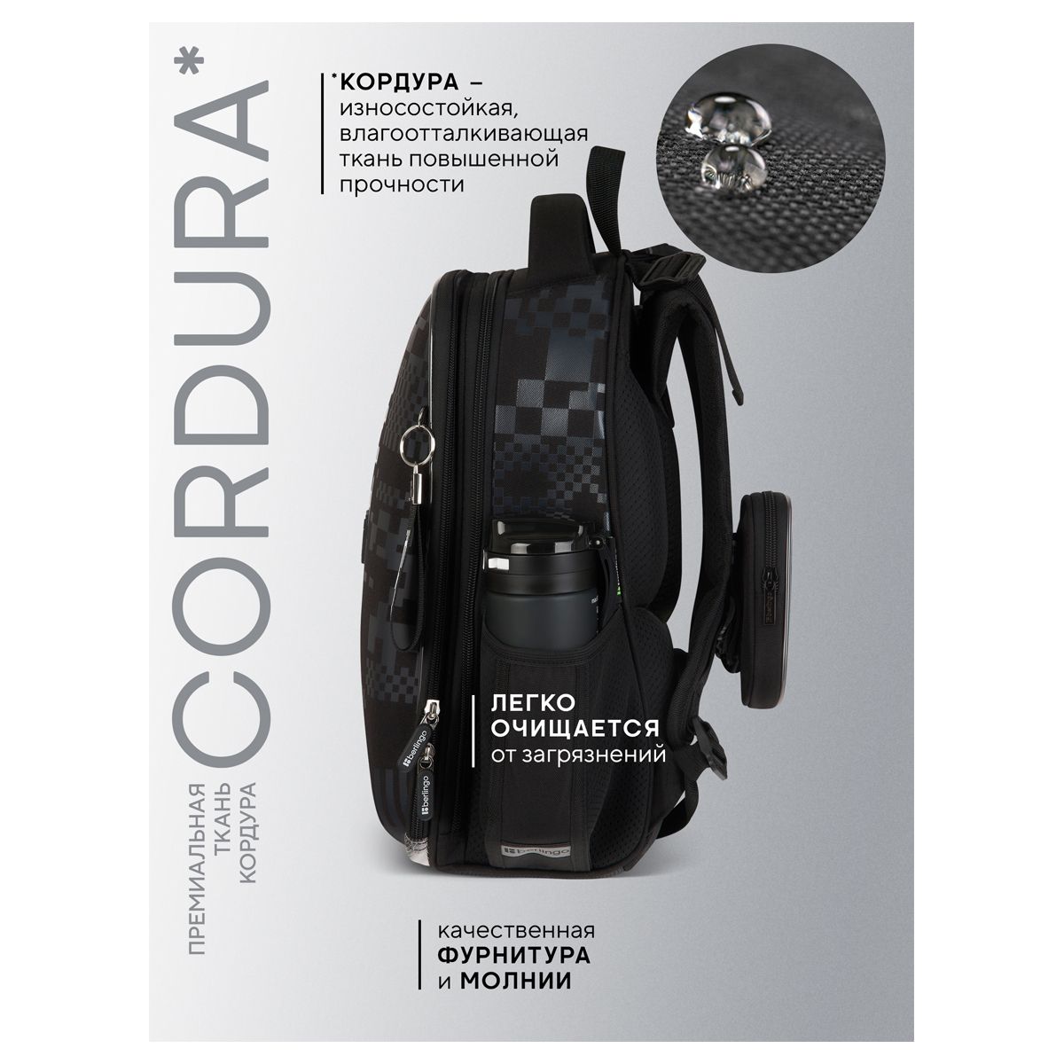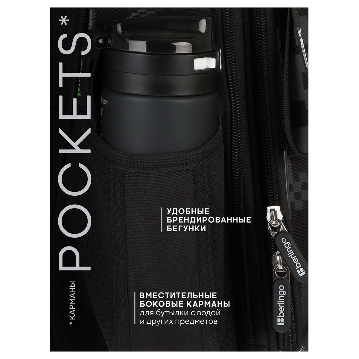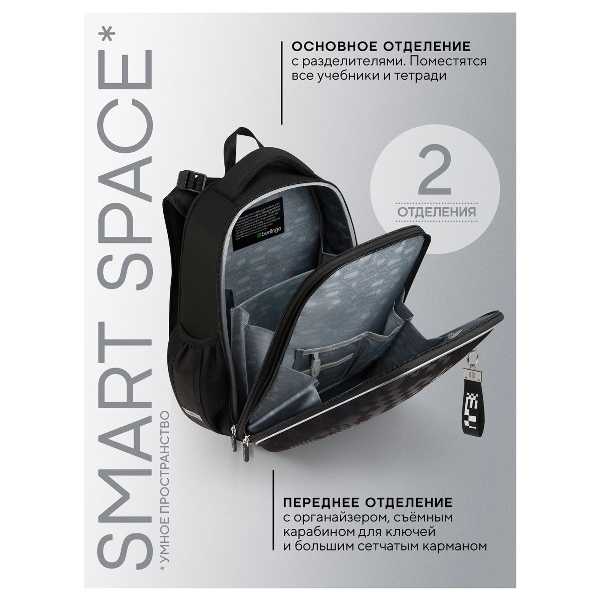 Ранец имеет 2 отделения, 2 боковых кармана на резинке, съемный кошелек на лямке для быстрого доступа к необходимым вещам. Внутри предусмотрены разделители для учебных пособий, органайзер для письменных принадлежностей, карман для мобильного телефона, съемный карабин для ключей и именная карточка для подписи.