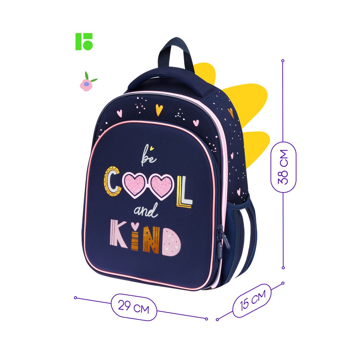 Ранец объёмом 16,5 литров имеет 2 отделения, 2 боковых кармана, съемный кошелек на лямке для быстрого доступа к необходимым вещам. Внутри предусмотрены разделители для учебных пособий, а также органайзер, которые помогают ребенку поддерживать порядок и аккуратно хранить школьные принадлежности.