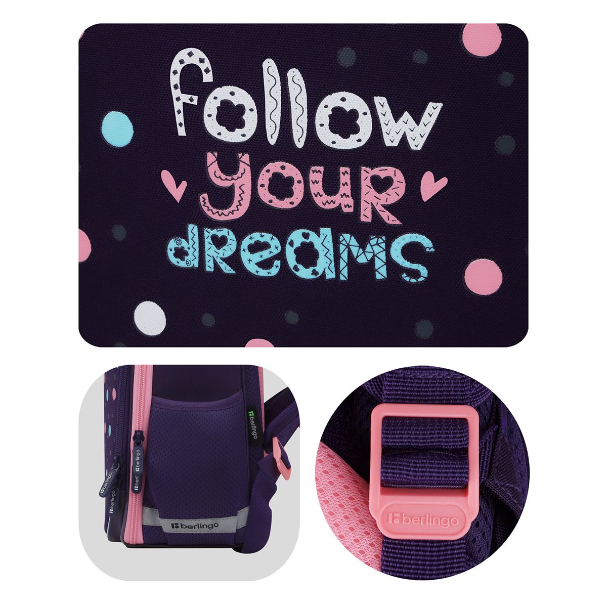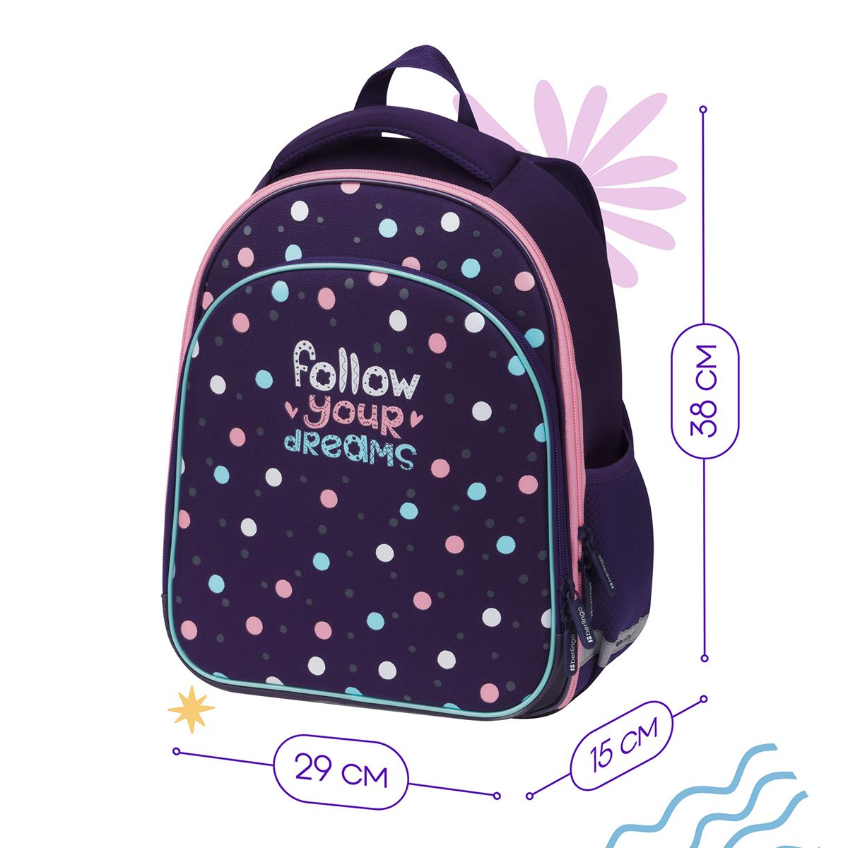 Благодаря анатомической вентилируемой спинке, а также регулируемым по длине лямкам и нагрудному креплению ранец плотно фиксируется на спине ребенка, равномерно распределяется нагрузка и сохраняется правильная осанка. Дно выполнено из водонепроницаемого материала с пластиковыми ножками для защиты содержимого от влаги. Ранец оснащен плотной ручкой и петлей для подвешивания. Световозвращающие элементы на лямках, передней и боковой частях ранца обеспечивают безопасность в темное время суток.