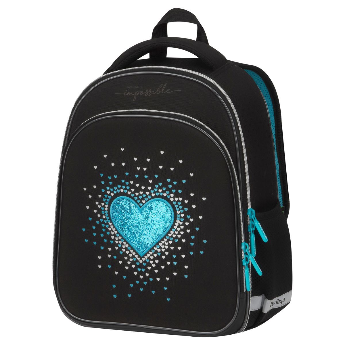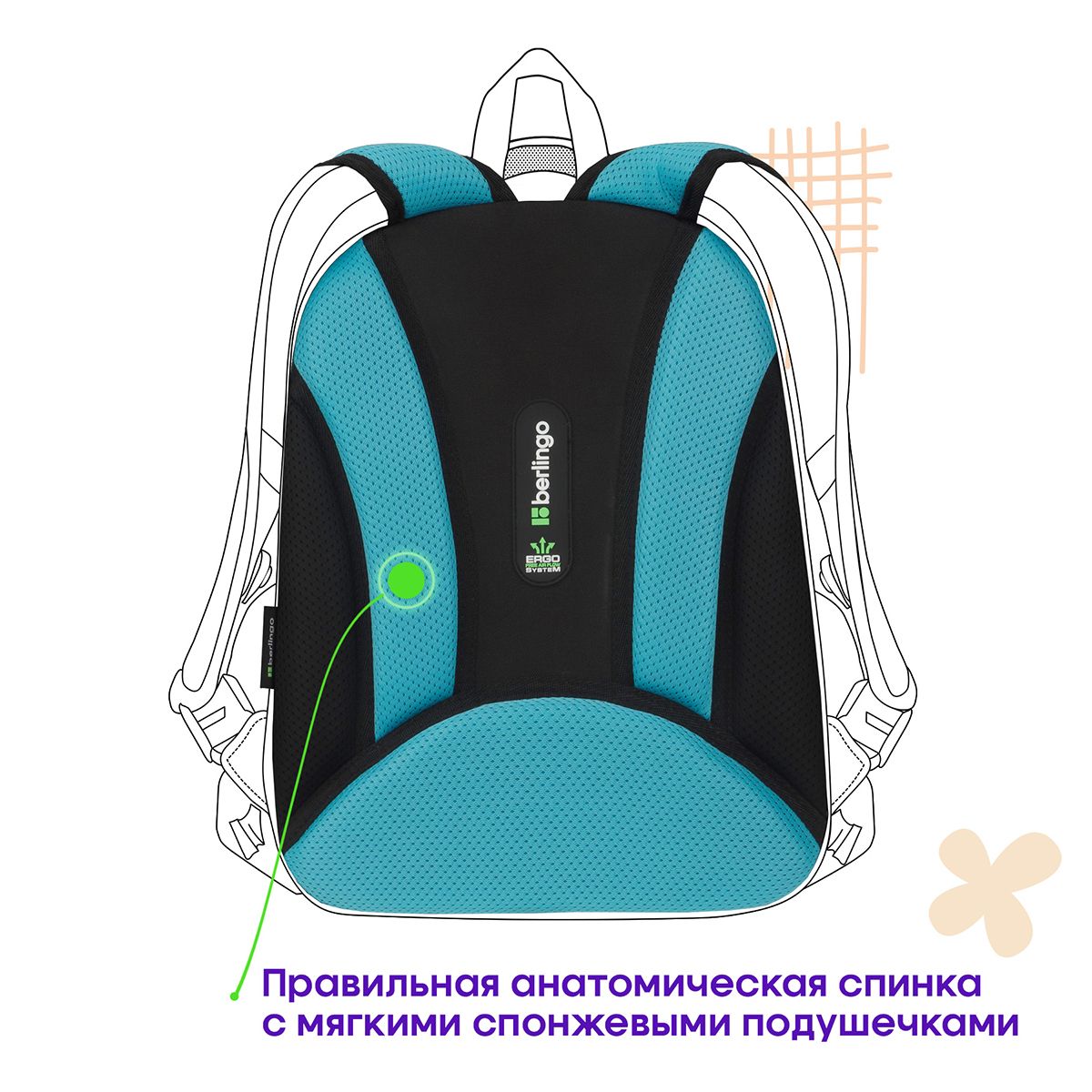 Благодаря анатомической вентилируемой спинке, а также регулируемым по длине лямкам и нагрудному креплению ранец плотно фиксируется на спине ребенка, равномерно распределяется нагрузка и сохраняется правильная осанка. Дно выполнено из водонепроницаемого материала с пластиковыми ножками для защиты содержимого от влаги. Ранец оснащен плотной ручкой и петлей для подвешивания. Световозвращающие элементы на лямках, передней и боковой частях ранца обеспечивают безопасность в темное время суток.