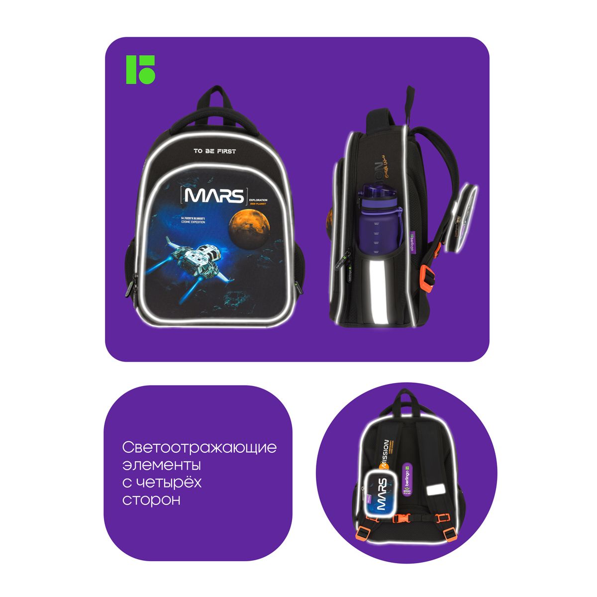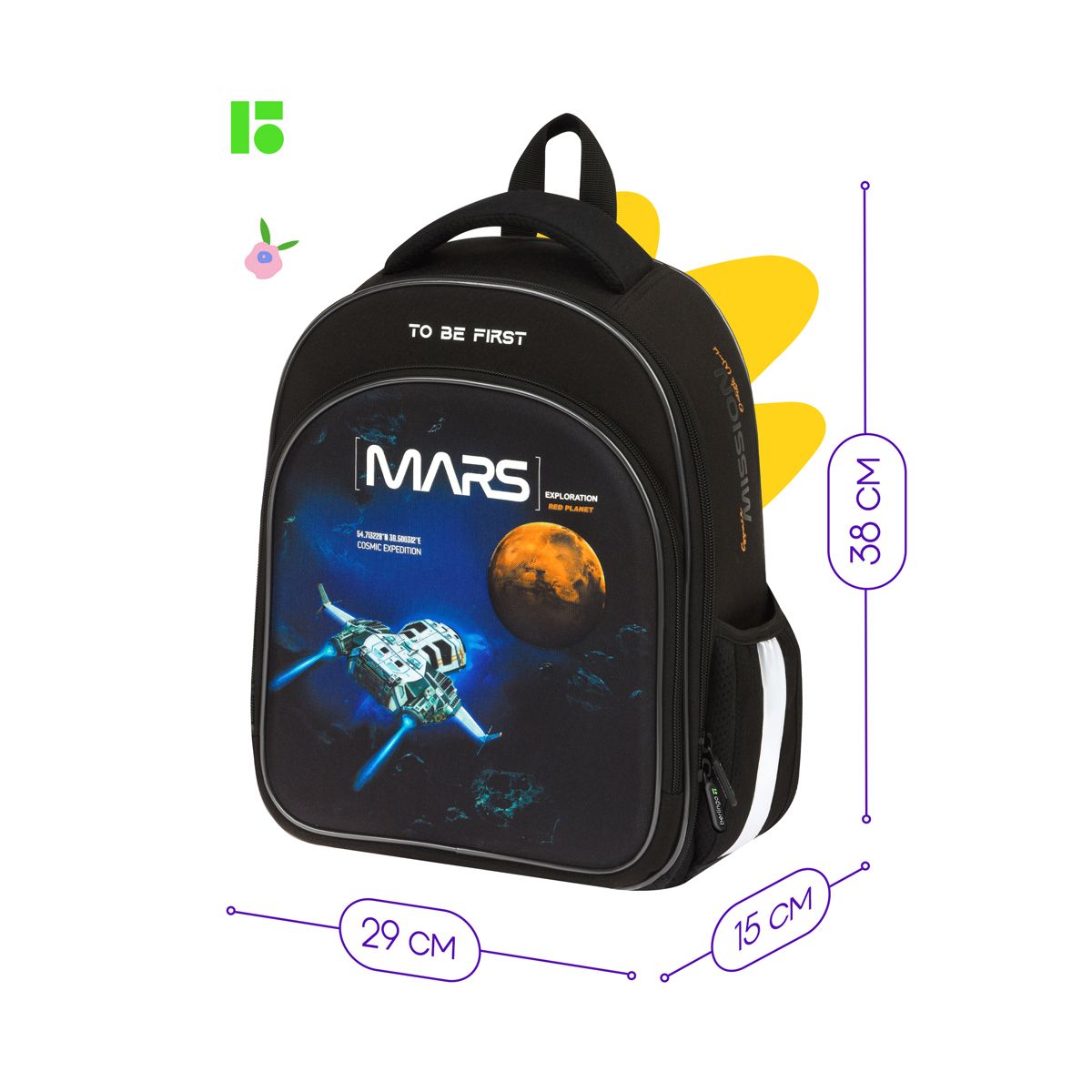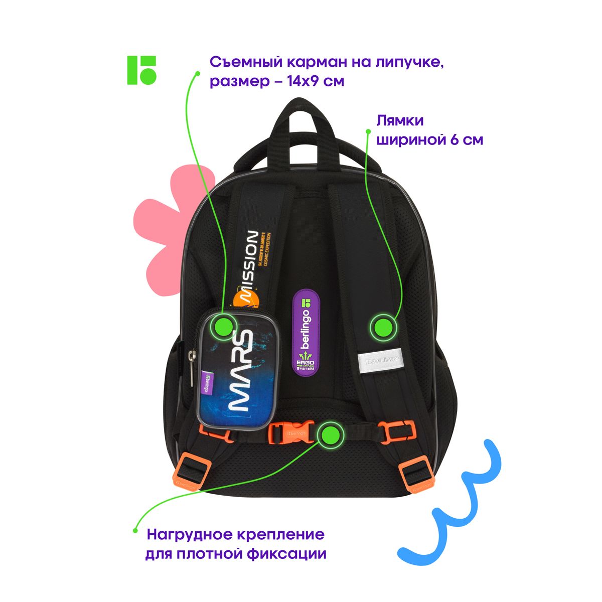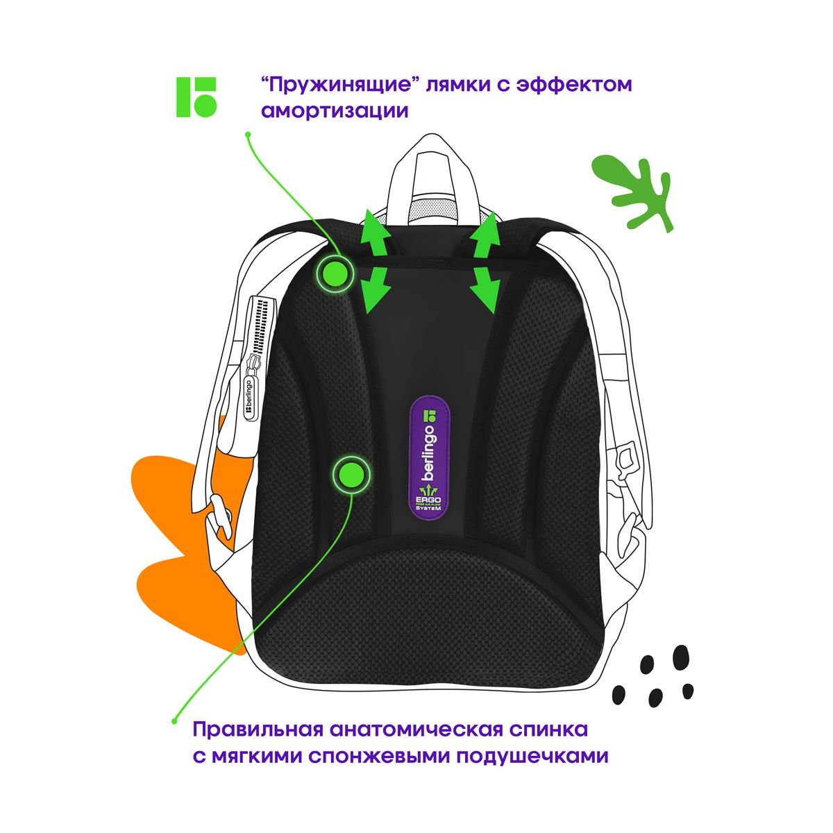 Благодаря анатомической вентилируемой спинке, а также регулируемым по длине лямкам и нагрудному креплению ранец плотно фиксируется на спине ребенка, равномерно распределяется нагрузка и сохраняется правильная осанка. Ранец оснащен усовершенствованной конструкцией лямок с амортизирующим эффектом, которая помогает снизить нагрузку на плечи и спину ребенка. Дно выполнено из водонепроницаемого материала и оснащено пластиковыми ножками для защиты содержимого от влаги. Ранец оснащен плотной ручкой и петлей для подвешивания. Световозвращающие элементы на лямках, передней и боковой частях ранца обеспечивают безопасность в темное время суток. Вес 1 кг.