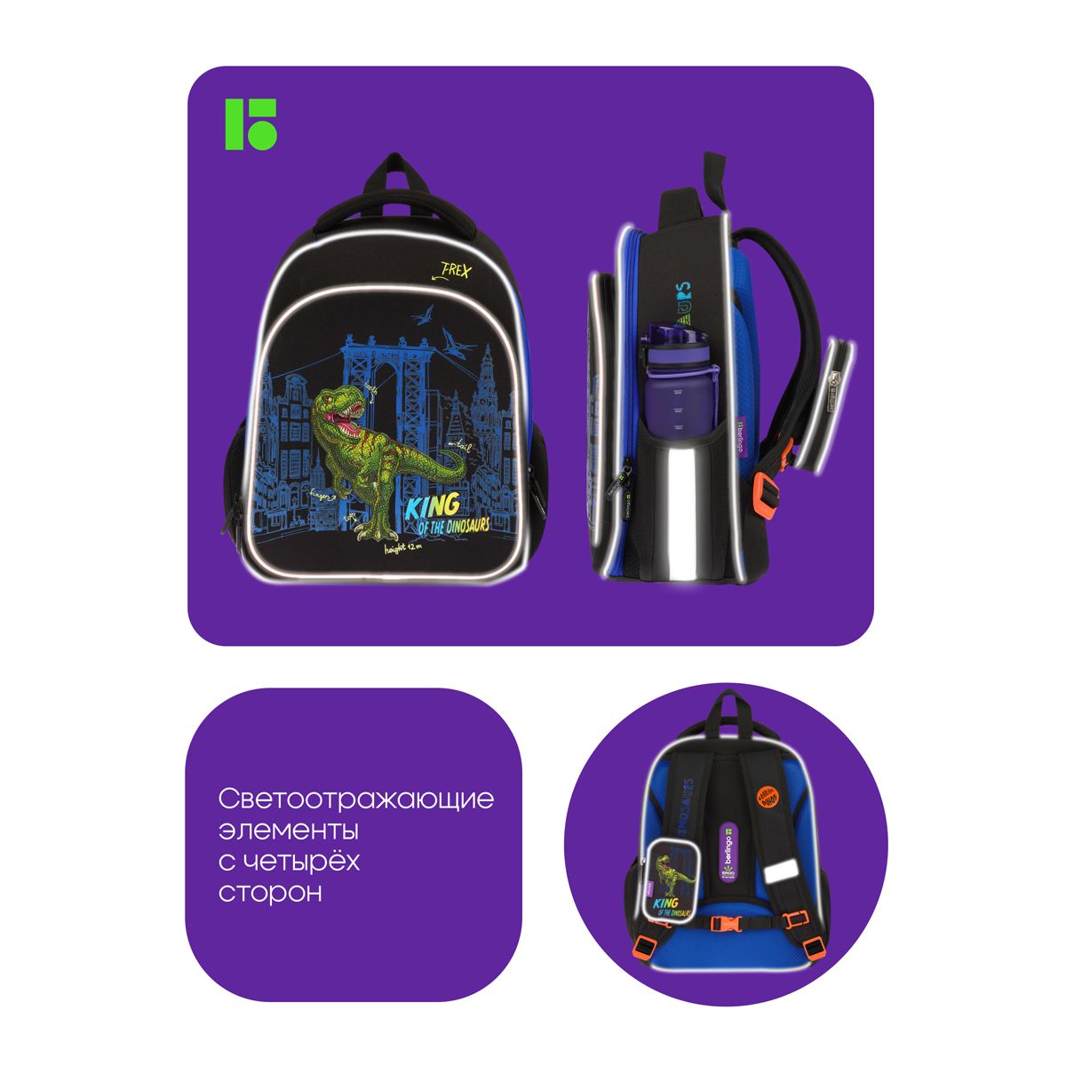 Благодаря анатомической вентилируемой спинке, а также регулируемым по длине лямкам и нагрудному креплению ранец плотно фиксируется на спине ребенка, равномерно распределяется нагрузка и сохраняется правильная осанка. Ранец оснащен усовершенствованной конструкцией лямок с амортизирующим эффектом, которая помогает снизить нагрузку на плечи и спину ребенка. Дно выполнено из водонепроницаемого материала и оснащено пластиковыми ножками для защиты содержимого от влаги. Ранец оснащен плотной ручкой и петлей для подвешивания. Световозвращающие элементы на лямках, передней и боковой частях ранца обеспечивают безопасность в темное время суток. Вес 1 кг.