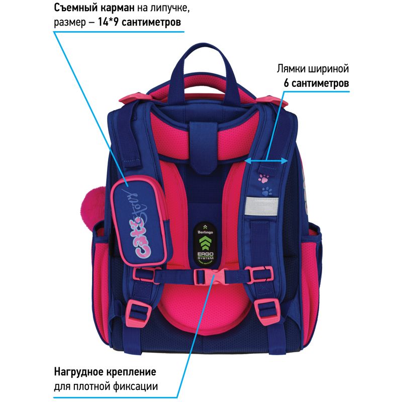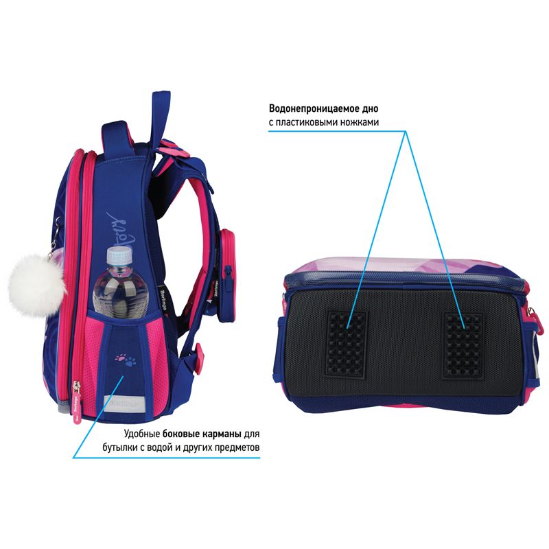 Ранец для школы имеет 2 отделения, 2 боковых кармана на резинке, съемный кошелек на лямке для быстрого доступа к необходимым вещам. Внутри предусмотрены разделители для учебных пособий, органайзер для письменных принадлежностей, карман для мобильного телефона, карабин для ключей и именная карточка для подписи. Уплотненная мягкая ручка и петля для подвешивания к парте делают ранец очень удобным. Дно выполнено из водонепроницаемого материала с пластиковыми ножками для защиты от влаги. Световозвращающие элементы на лямках, передней и боковых частях ранца обеспечивают безопасность ребенка в темное время суток. Подвеска в подарок.