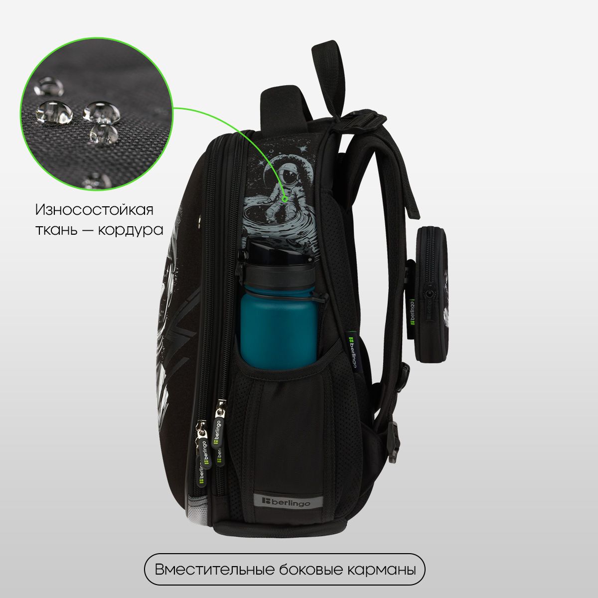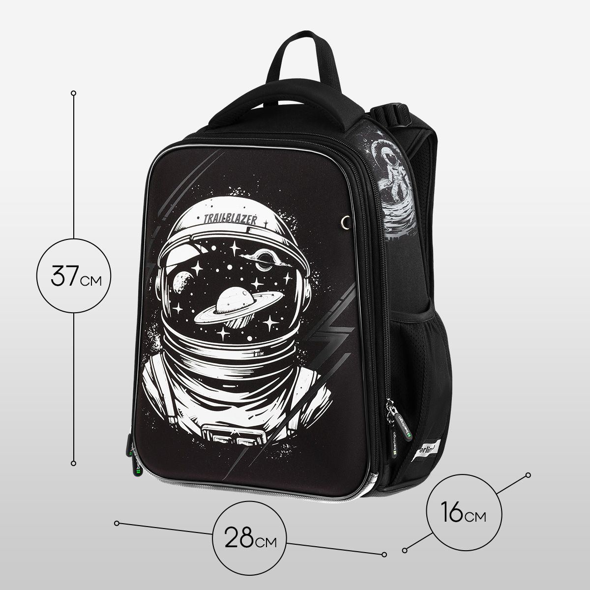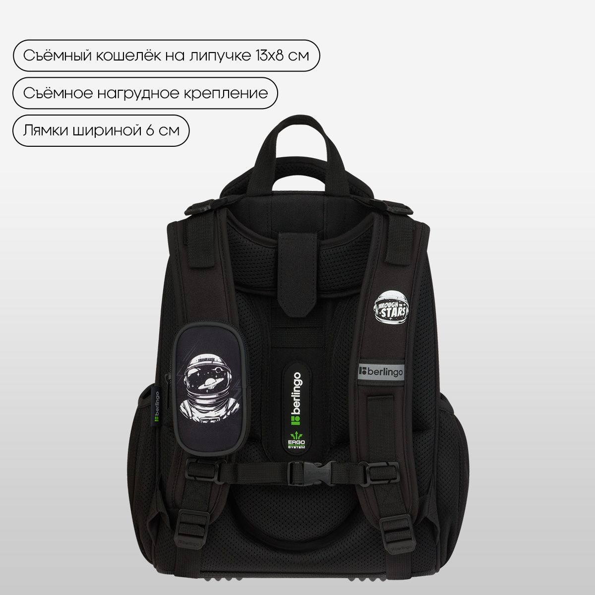 Ранец имеет 2 отделения, 2 боковых кармана на резинке, съемный кошелек на лямке для быстрого доступа к необходимым вещам. Внутри предусмотрены разделители для учебных пособий, органайзер для письменных принадлежностей, карман для мобильного телефона, съемный карабин для ключей и именная карточка для подписи.