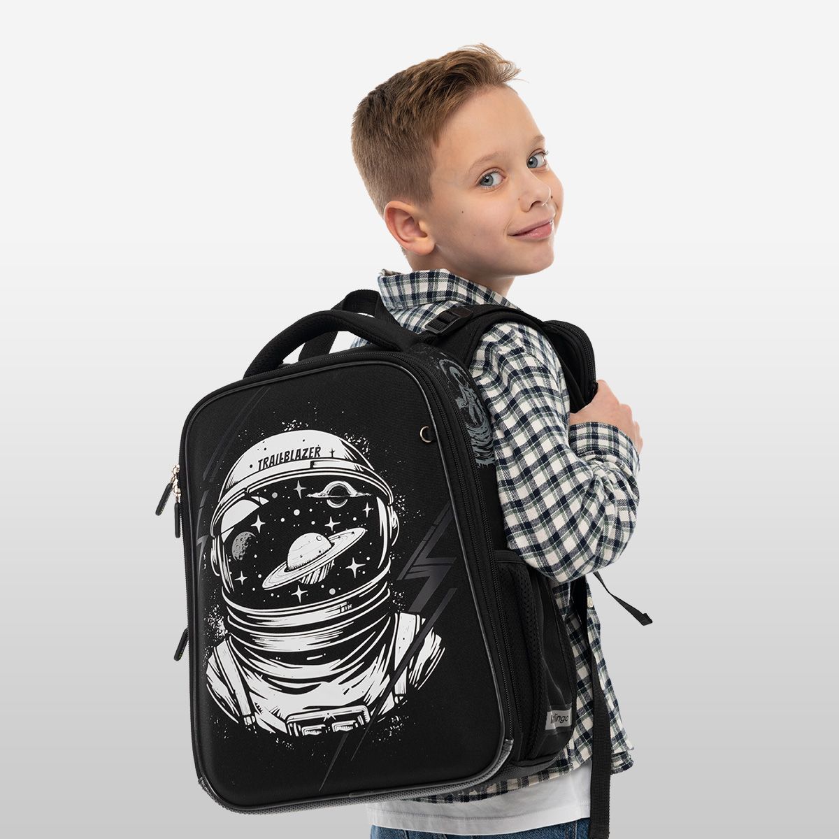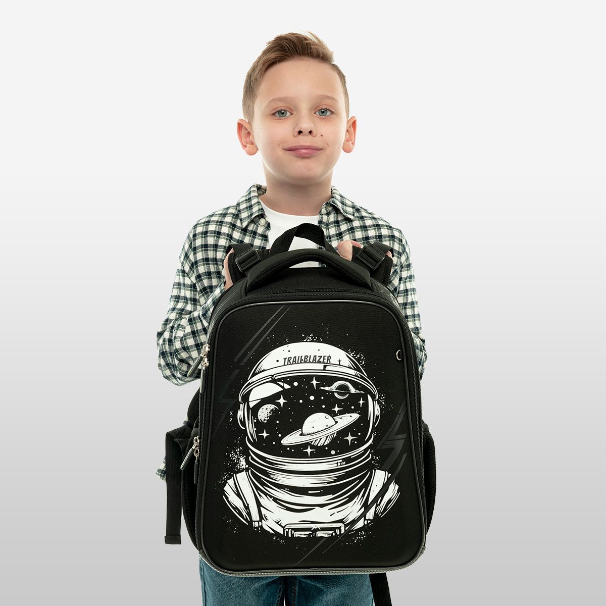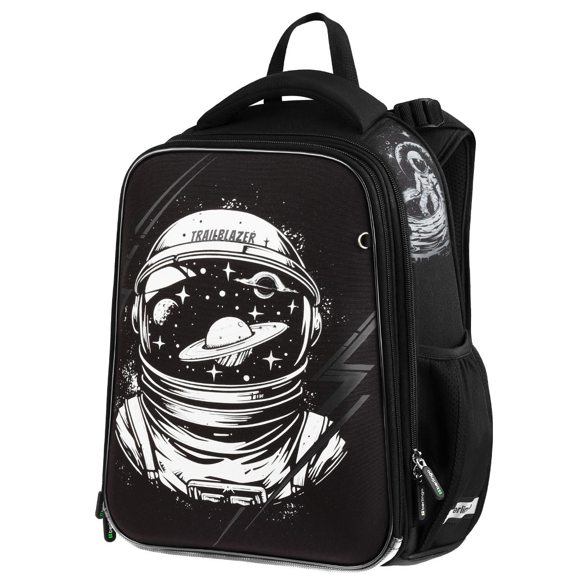 Ранец имеет 2 отделения, 2 боковых кармана на резинке, съемный кошелек на лямке для быстрого доступа к необходимым вещам. Внутри предусмотрены разделители для учебных пособий, органайзер для письменных принадлежностей, карман для мобильного телефона, съемный карабин для ключей и именная карточка для подписи.