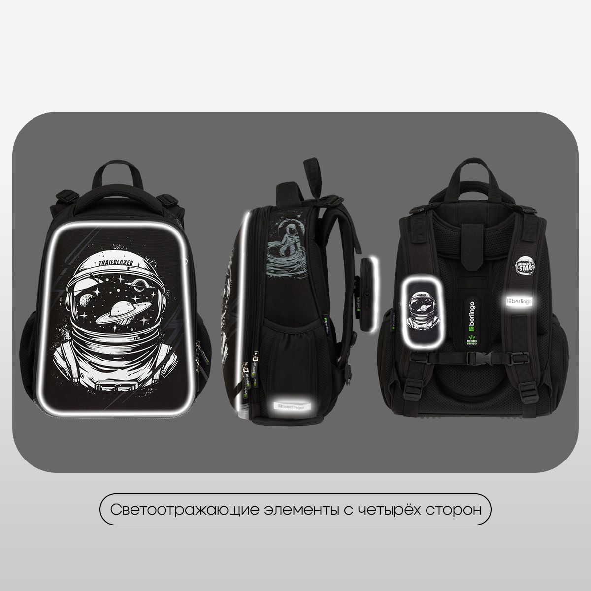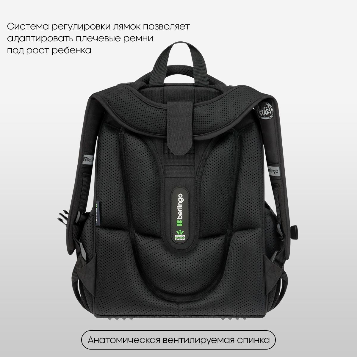 Благодаря анатомической вентилируемой спинке, регулируемым по длине и высоте лямкам, а также нагрудному креплению ранец плотно фиксируется на спине ребенка, что помогает равномерно распределить нагрузку и сохранить правильную осанку. Уплотненная мягкая ручка и петля для подвешивания к парте делают ранец очень удобным. Дно выполнено из водонепроницаемого материала с пластиковыми ножками для защиты от влаги. Световозвращающие элементы на лямках, передней и боковых частях ранца обеспечивают безопасность ребенка в темное время суток. Вес ранца менее 1 кг.