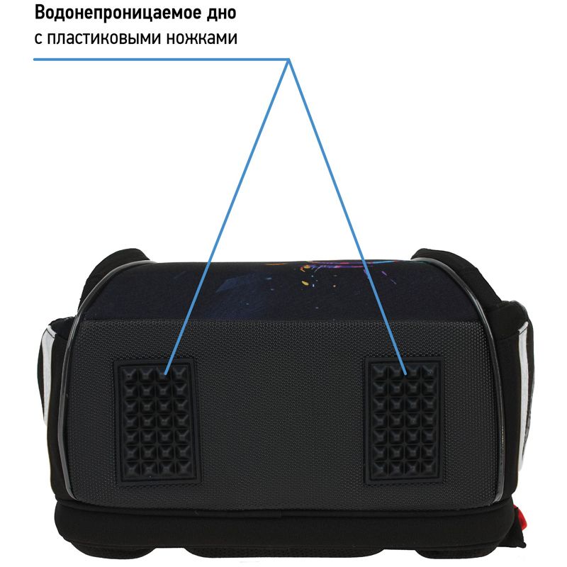 Ранец для школы имеет 2 отделения, 2 боковых кармана на молнии. Внутри предусмотрены разделители для учебных пособий, органайзер для письменных принадлежностей, карман для мобильного телефона, карабин для ключей и именная карточка для подписи. Отделение у спинки предназначено для учебных пособий формата А4+. Уплотненная мягкая ручка и петля для подвешивания к парте делают ранец очень удобным. Дно выполнено из водонепроницаемого материала с пластиковыми ножками для защиты содержимого от влаги. Световозвращающие элементы на лямках, передней и боковых частях ранца обеспечивают безопасность ребенка в темное время суток.