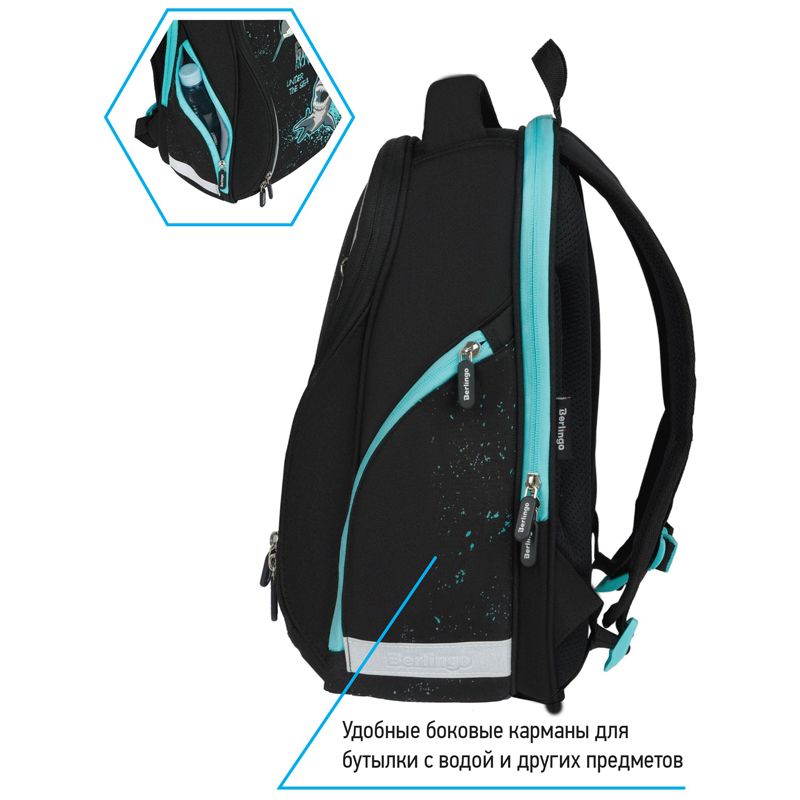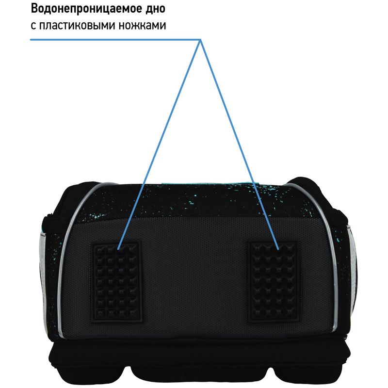 Ранец для школы имеет 2 отделения, 2 боковых кармана на молнии. Внутри предусмотрены разделители для учебных пособий, органайзер для письменных принадлежностей, карман для мобильного телефона, карабин для ключей и именная карточка для подписи. Отделение у спинки предназначено для учебных пособий формата А4+. Уплотненная мягкая ручка и петля для подвешивания к парте делают ранец очень удобным. Дно выполнено из водонепроницаемого материала с пластиковыми ножками для защиты содержимого от влаги. Световозвращающие элементы на лямках, передней и боковых частях ранца обеспечивают безопасность ребенка в темное время суток.