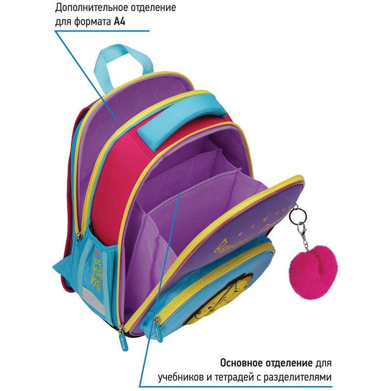 Ранец объёмом 14 литров имеет 2 отделения, 1 передний карман на молнии, 2 боковых кармана на резинке, на спинке потайной карман на молнии. Внутри предусмотрены разделители для учебных пособий и именная карточка для подписи. Отделение у спинки вмещает формат А4+.