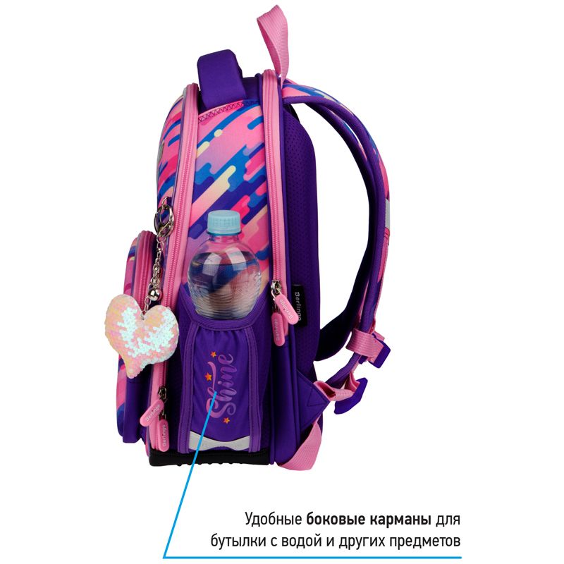 Ранец объёмом 14 литров имеет 2 отделения, 1 передний карман на молнии, 2 боковых кармана на резинке, на спинке потайной карман на молнии. Внутри предусмотрены разделители для учебных пособий и именная карточка для подписи. Отделение у спинки вмещает формат А4+.
