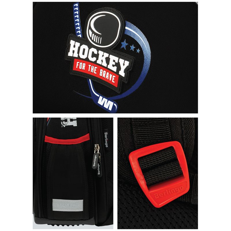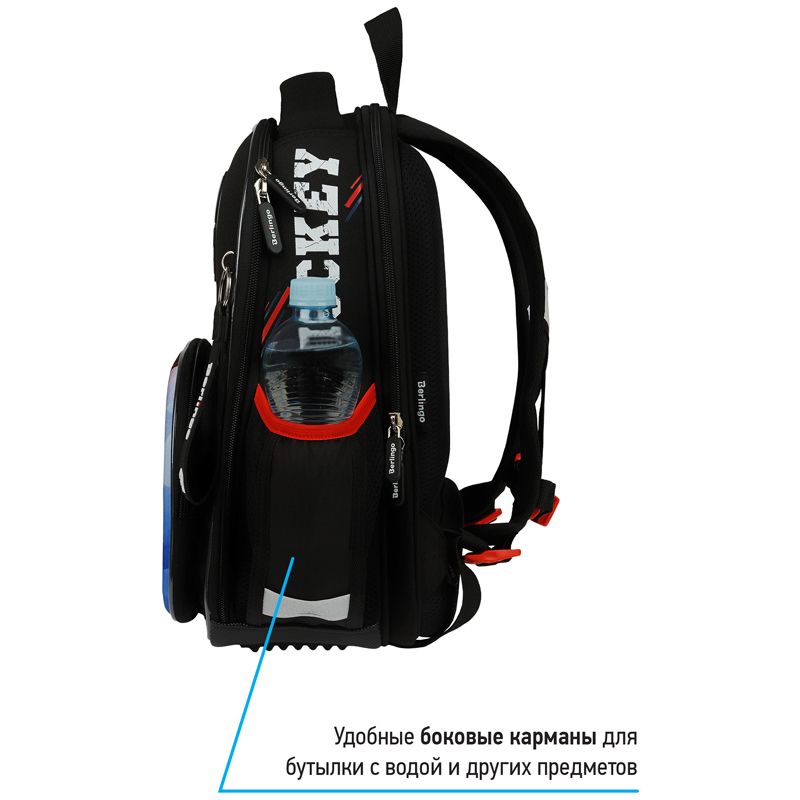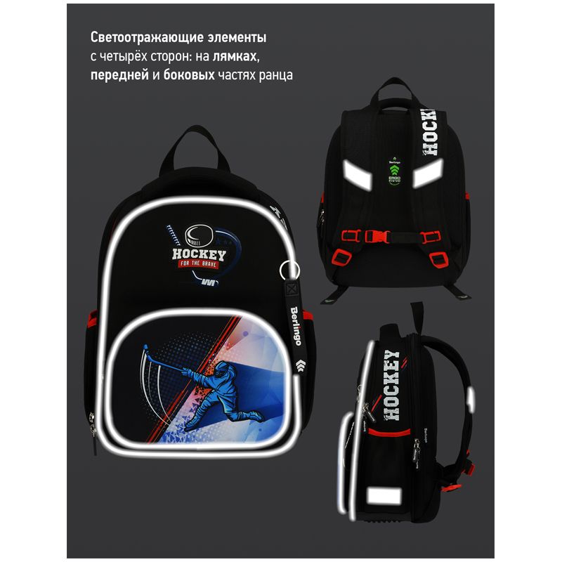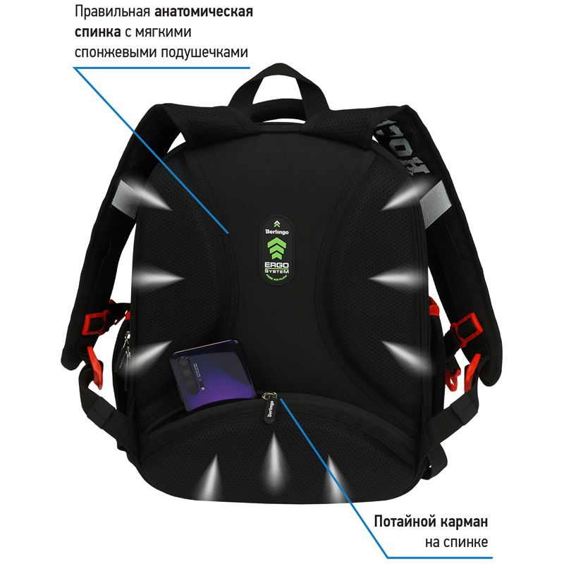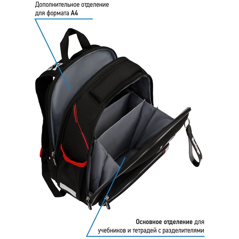 Ранец объёмом 14 литров имеет 2 отделения, 1 передний карман на молнии, 2 боковых кармана на резинке, на спинке потайной карман на молнии. Внутри предусмотрены разделители для учебных пособий и именная карточка для подписи. Отделение у спинки вмещает формат А4+.