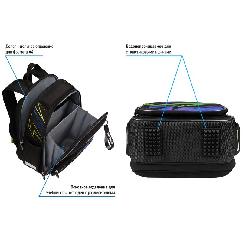 Ранец объёмом 14 литров имеет 2 отделения, 1 передний карман на молнии, 2 боковых кармана на резинке, на спинке потайной карман на молнии. Внутри предусмотрены разделители для учебных пособий и именная карточка для подписи. Отделение у спинки вмещает формат А4+.