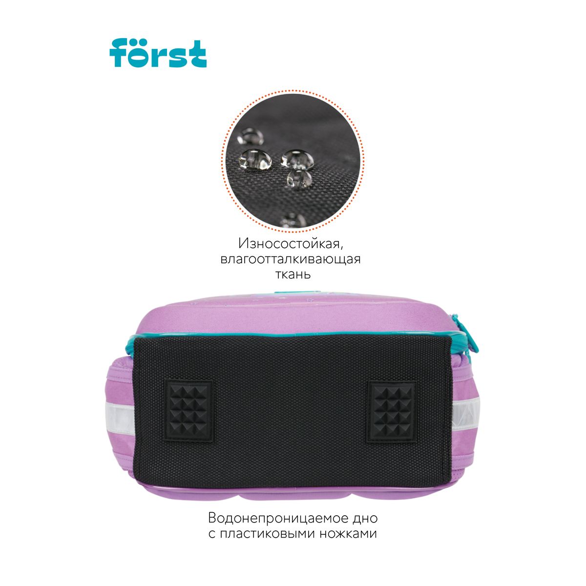 Дно выполнено из водонепроницаемого материала с пластиковыми ножками для защиты от влаги. Ранец оснащен плотной ручкой и петлей для подвешивания. Световозвращающие элементы на передней части, сбоку и на лямках обеспечивают безопасность в темное время суток. Вес не более 850 грамм.