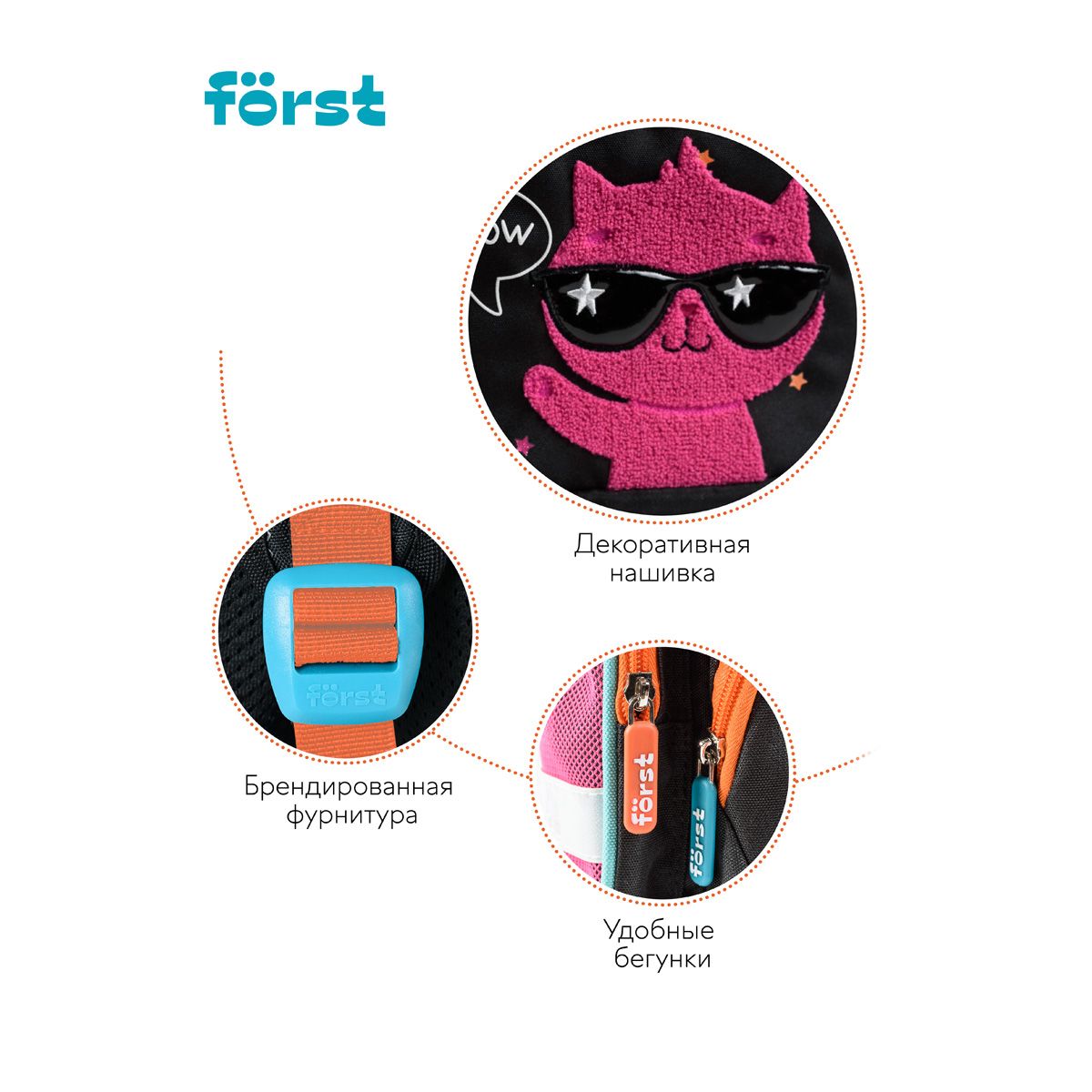 Ранец Först F-Set "Cool kitty" 35*29*16 см, 1 отделение, 3 кармана, анатомическая спинка, пенал, мешок для обуви