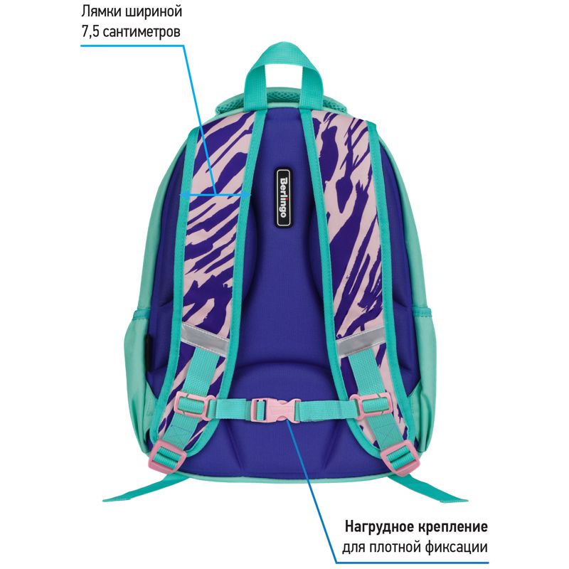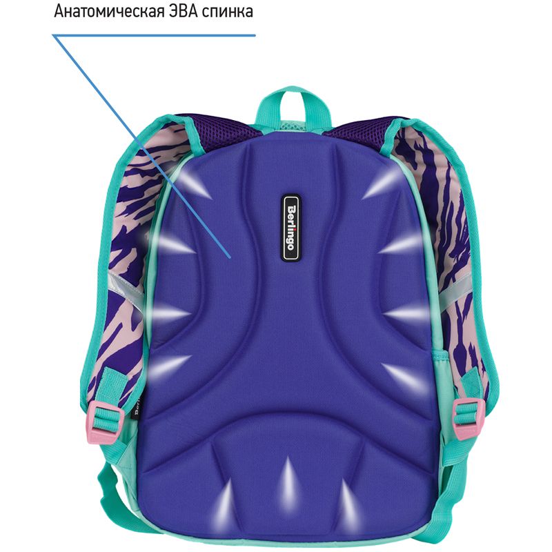 Формованная спинка из экологичного ЭВА-материала устойчива к деформации, создана с учетом анатомического строения спины ребенка, имеет вентиляционные каналы для свободной циркуляции воздуха. Плотные лямки с возможностью регулировки и нагрудный фиксатор позволяют равномерно распределить нагрузку на спину ребенка. Световозвращающие элементы обеспечивают безопасность в темное время суток. Вес изделия 510 граммов.