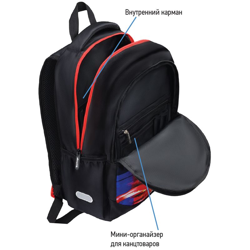 В модели предусмотрены 2 отделения, 1 передний кармана на молнии, 2 боковых кармана, уплотненное дно. Внутри имеется 1 карман на резинке, 2 открытых кармана, 1 карман на молнии, мини-органайзер для канцтоваров. Объём – 13,5 литров.
