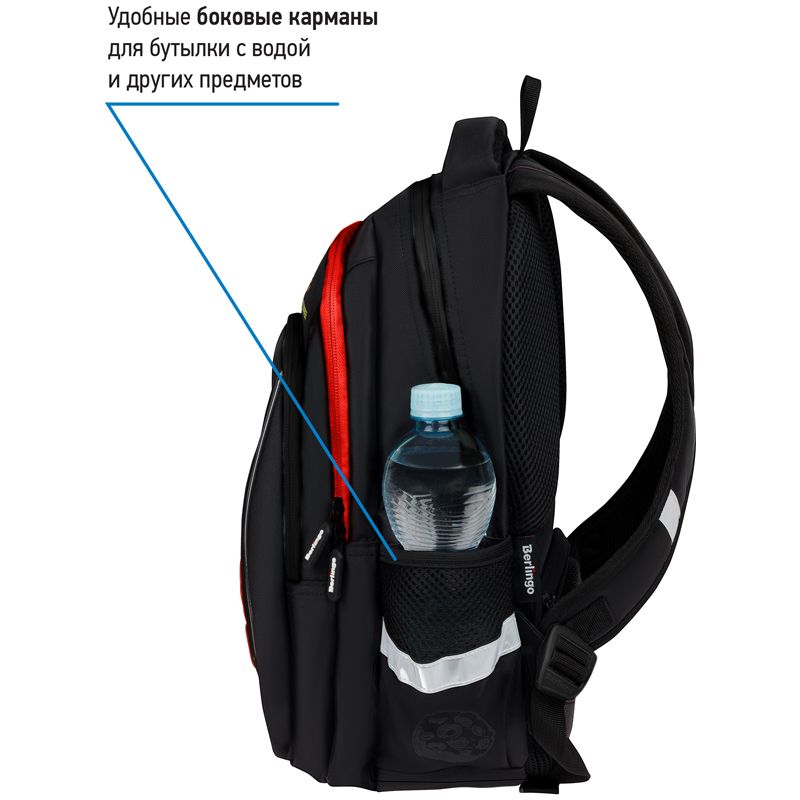 Эргономичная вентилируемая спинка, широкие регулируемые лямки и нагрудное крепление обеспечивают равномерное распределение нагрузки на позвоночник, а усиленное дно, плотная ручка и петля для подвешивания делают рюкзак максимально удобным. Световозвращающие элементы помогают обеспечить безопасность ребенка в темное время суток. Вес изделия 700 граммов.