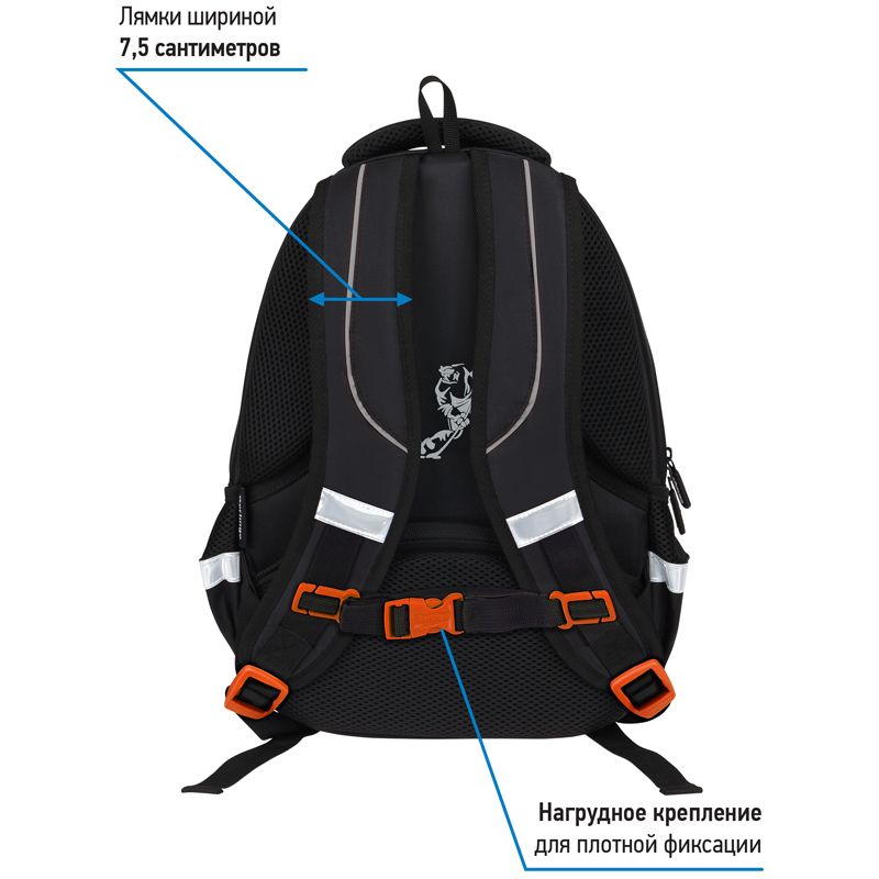 Эргономичная вентилируемая спинка, широкие регулируемые лямки и нагрудное крепление обеспечивают равномерное распределение нагрузки на позвоночник, а усиленное дно, плотная ручка и петля для подвешивания делают рюкзак максимально удобным. Световозвращающие элементы помогают обеспечить безопасность ребенка в темное время суток. Вес изделия 700 граммов.