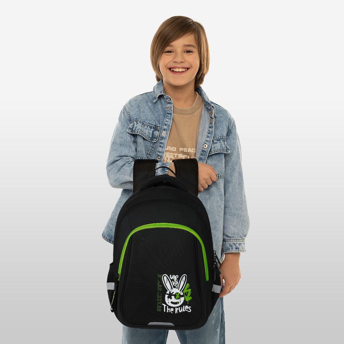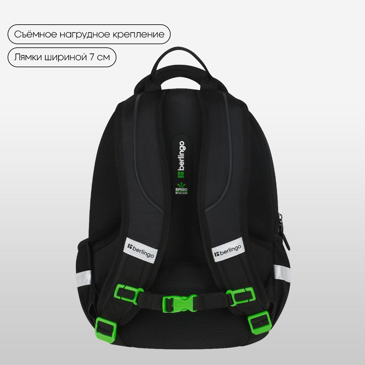 В рюкзаке предусмотрены 3 отделения и 2 боковых кармана. Внутри имеется 1 карман на резинке, 1 открытый карман и 1 карман из сетки на молнии. Эргономичная вентилируемая спинка, широкие регулируемые лямки и нагрудное крепление обеспечивают равномерное распределение нагрузки на позвоночник, а усиленное дно, плотная ручка для переноски и ручка-петля делают рюкзак максимально удобным. Световозвращающие элементы помогают обеспечить безопасность ребенка в темное время суток.