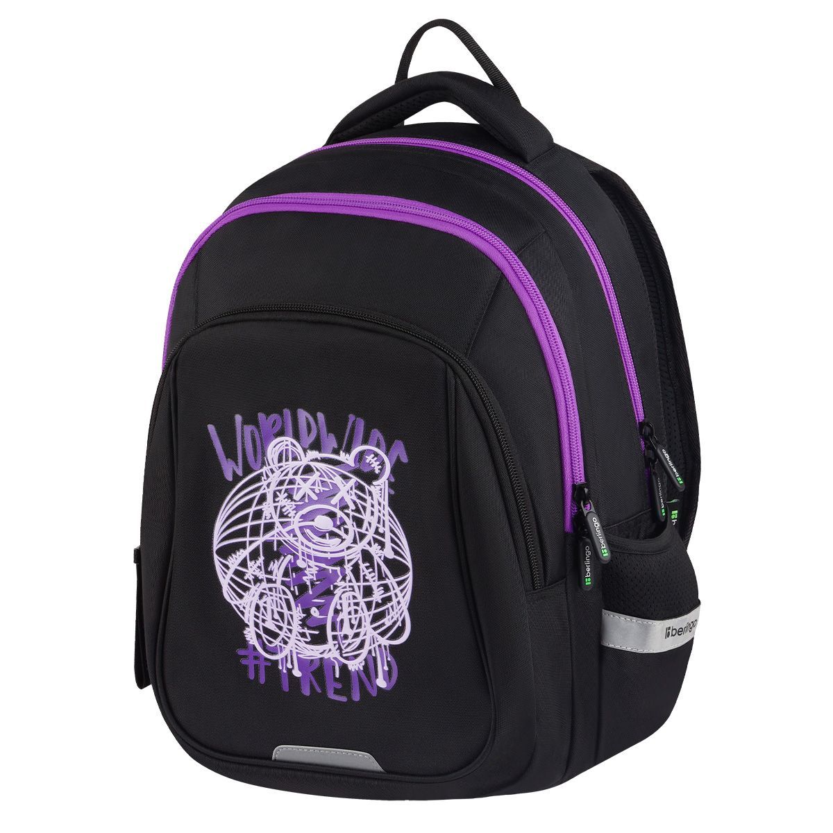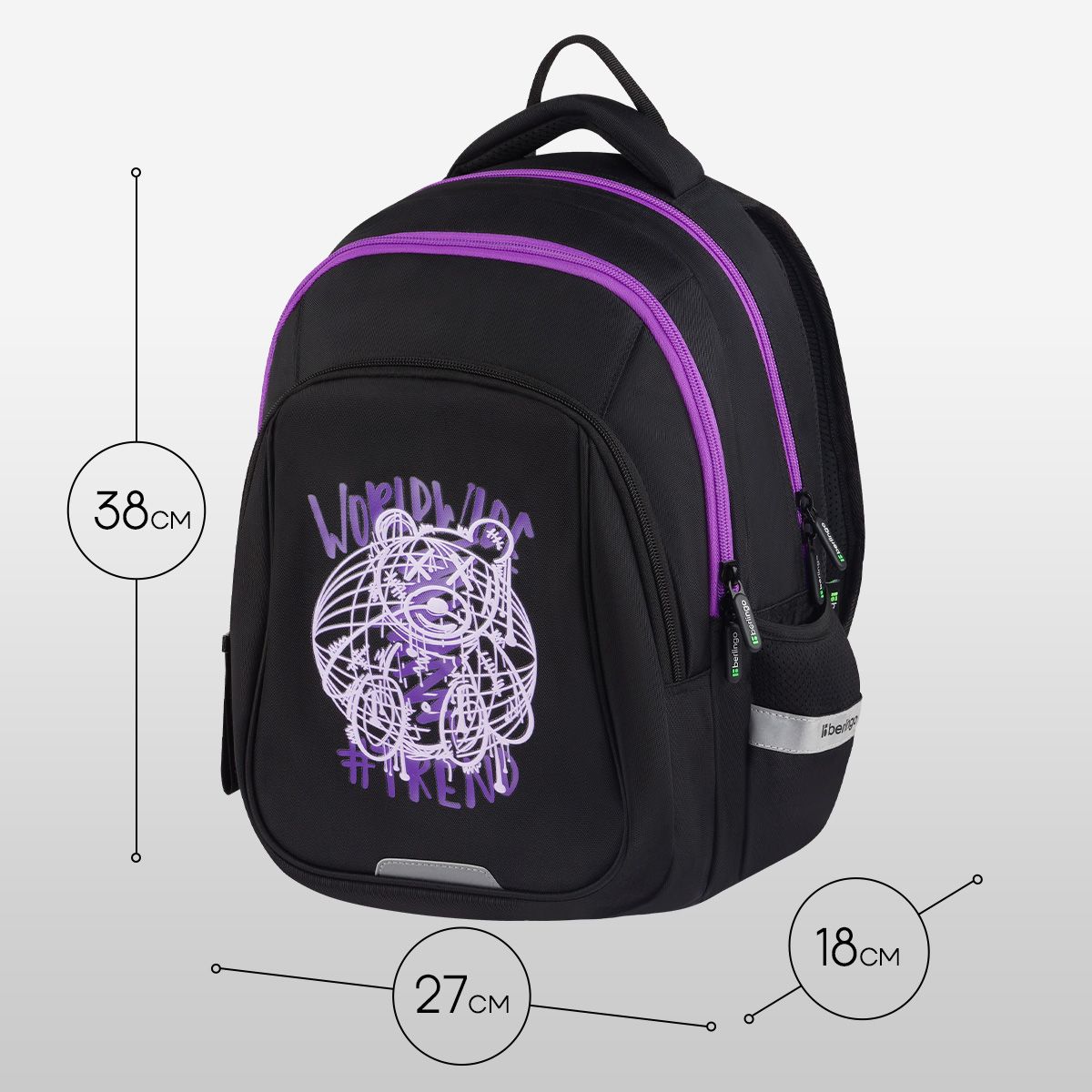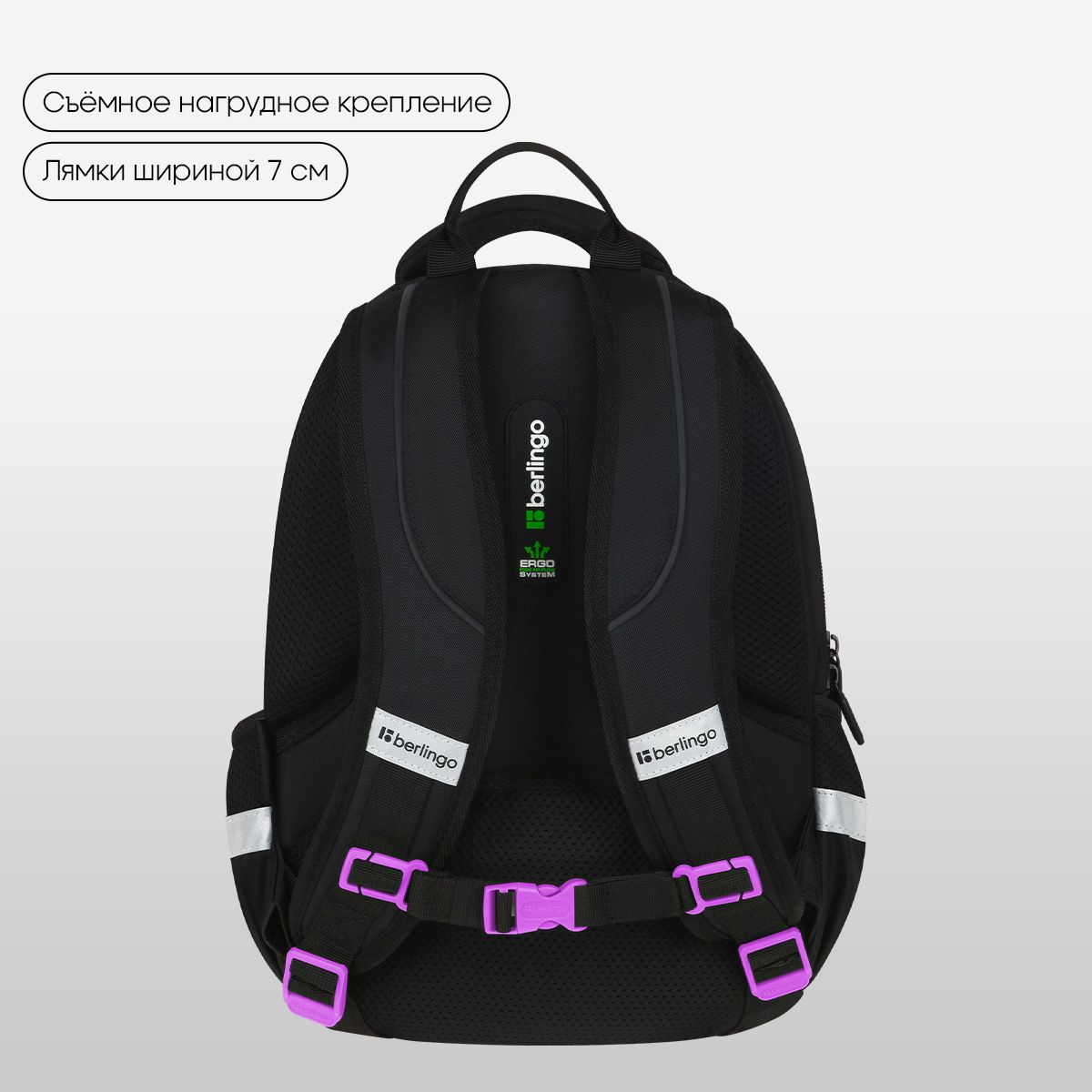 В рюкзаке предусмотрены 3 отделения и 2 боковых кармана. Внутри имеется 1 карман на резинке, 1 открытый карман и 1 карман из сетки на молнии. Эргономичная вентилируемая спинка, широкие регулируемые лямки и нагрудное крепление обеспечивают равномерное распределение нагрузки на позвоночник, а усиленное дно, плотная ручка для переноски и ручка-петля делают рюкзак максимально удобным. Световозвращающие элементы помогают обеспечить безопасность ребенка в темное время суток.