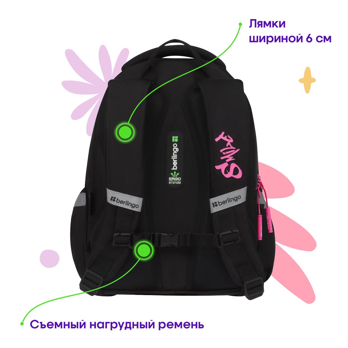 В рюкзаке предусмотрены 3 отделения и 2 боковых кармана. Внутри имеется 1 открытый карман, удобный внутренний органайзер, съемный карабин для ключей. Эргономичная вентилируемая спинка, широкие регулируемые лямки и нагрудное крепление обеспечивают равномерное распределение нагрузки на позвоночник, а водонепроницаемое дно, плотная ручка для переноски и ручка-петля делают рюкзак максимально удобным. Световозвращающие элементы помогают обеспечить безопасность ребенка в темное время суток.