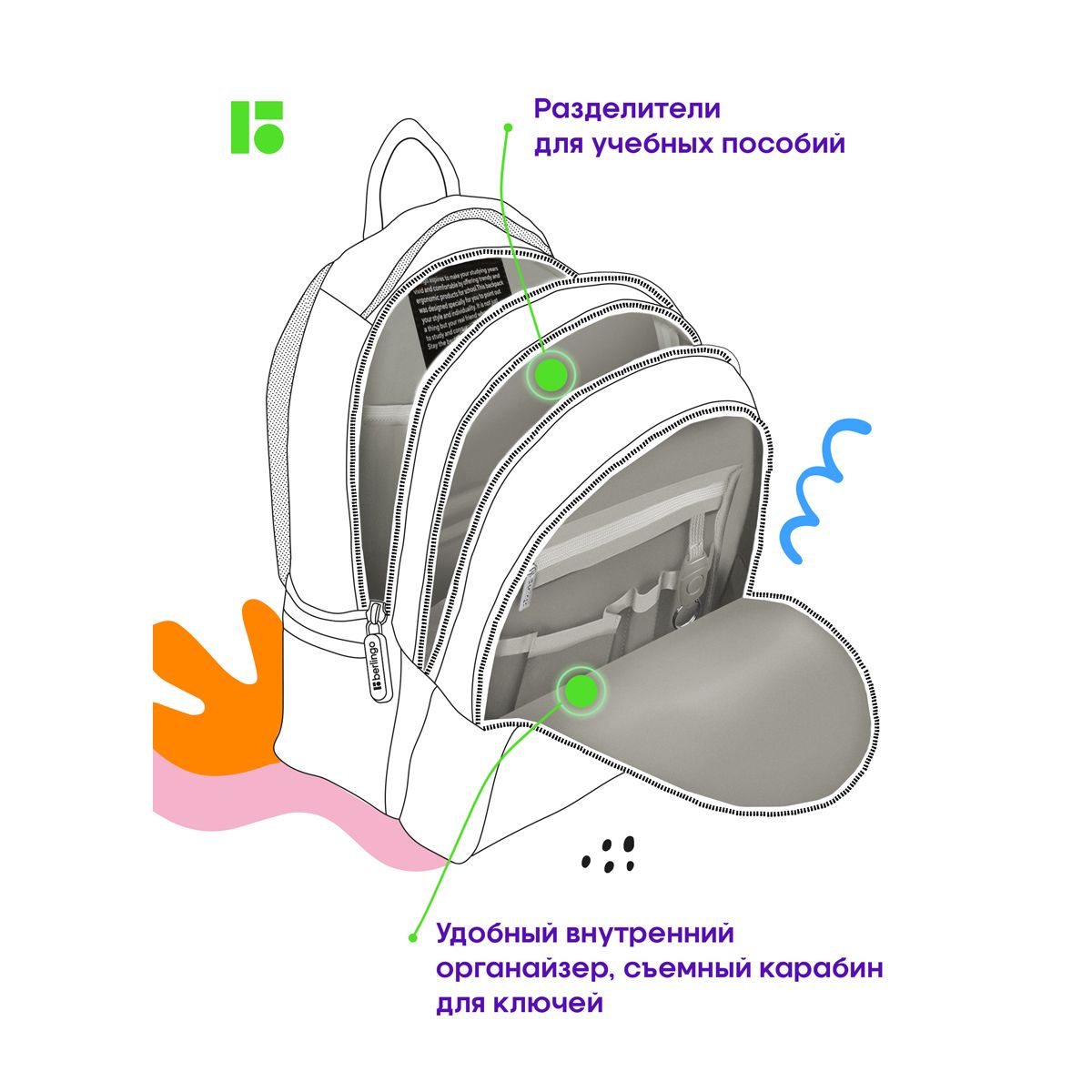 В рюкзаке предусмотрены 3 отделения и 2 боковых кармана. Внутри имеется 1 карман на резинке, 1 открытый карман, удобный внутренний органайзер, съемный карабин для ключей, разделители для учебных пособий. Рюкзак выполнен из твила, благодаря чему изделия обладают повышенной износостойкостью.