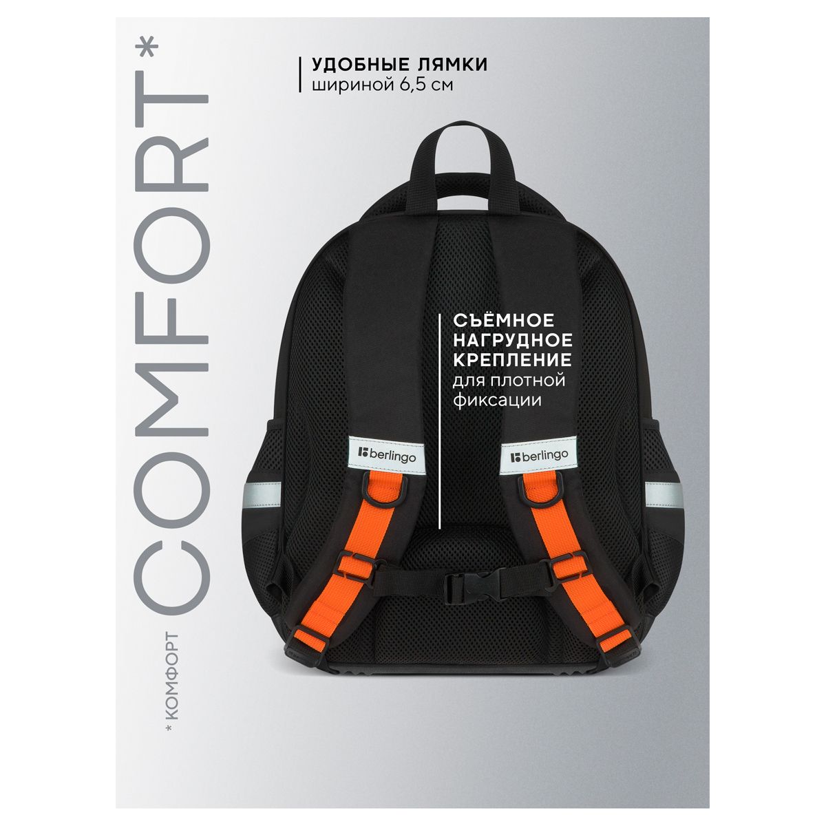 В рюкзаке предусмотрены 3 отделения и 2 боковых кармана. Эргономичная вентилируемая спинка, широкие регулируемые лямки и нагрудное крепление обеспечивают равномерное распределение нагрузки на позвоночник, а внутренние карманы, усиленное дно, плотная ручка для переноски и ручка-петля делают рюкзак максимально удобным. Световозвращающие элементы помогают обеспечить безопасность ребенка в темное время суток.