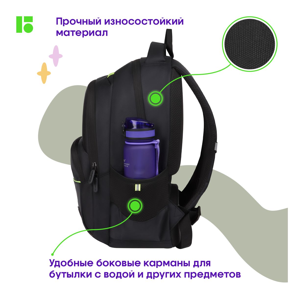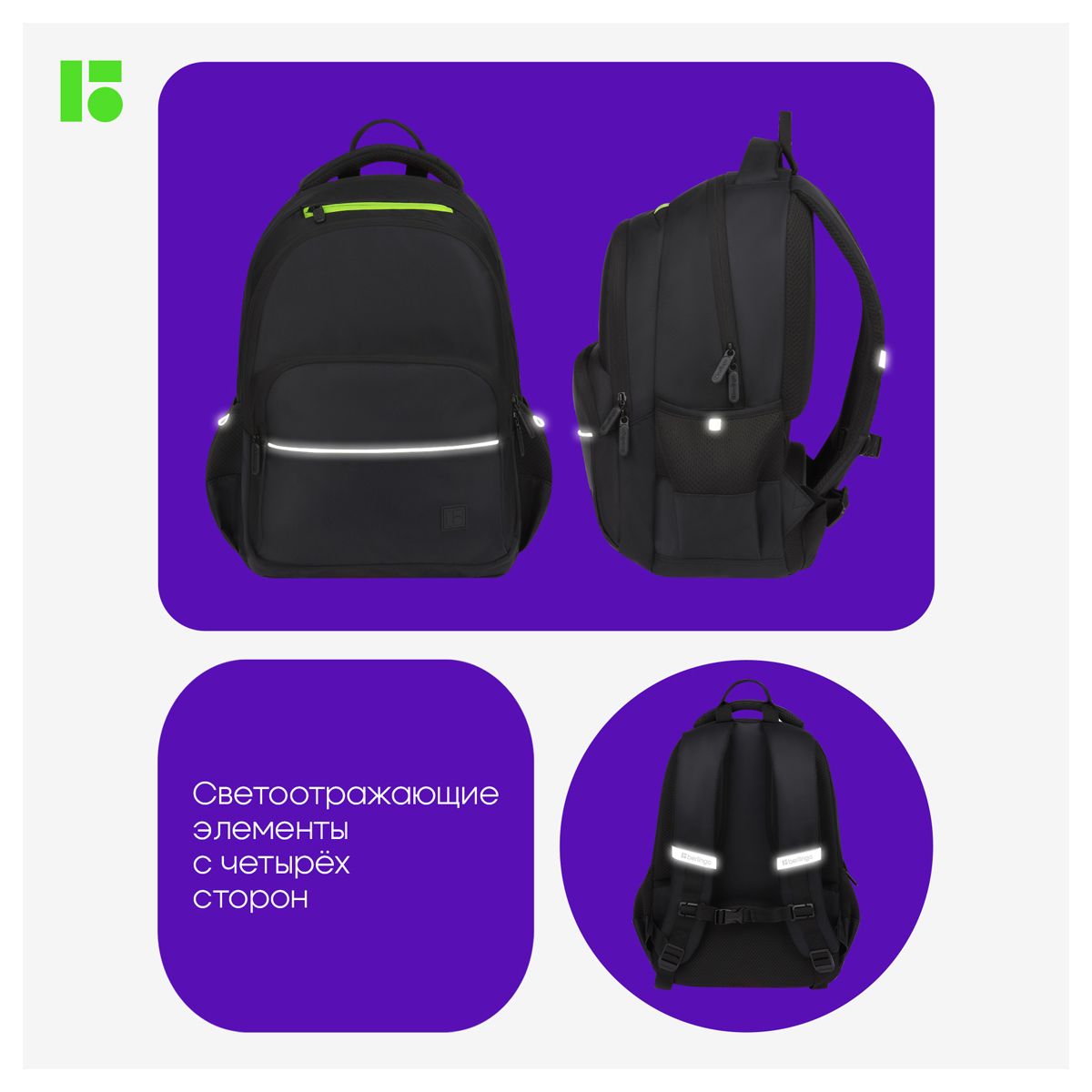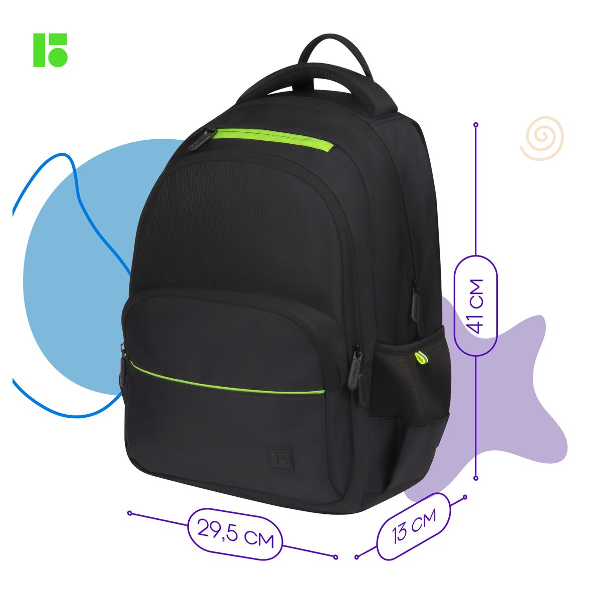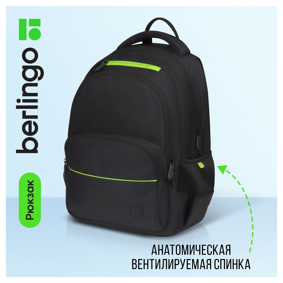 Рюкзак Berlingo U3 "Black-green" 41*29,5*13см, 2 отделения, 4 кармана, эргономичная спинка