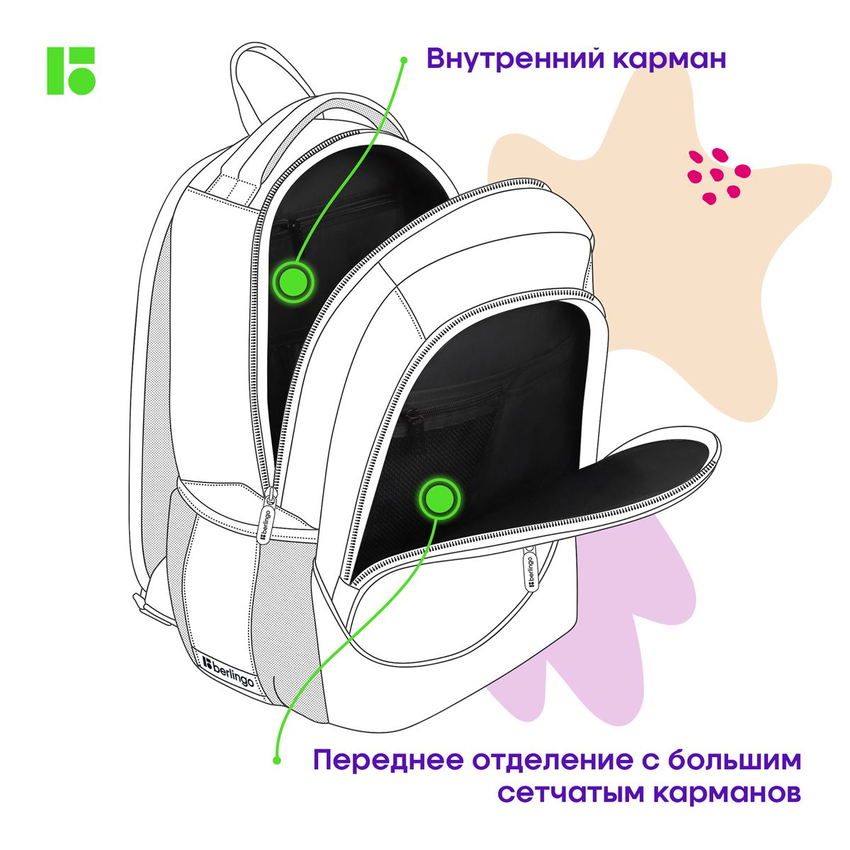 В рюкзаке предусмотрены 2 отделения и 3 кармана. Внутри имеется 1 карман на резинке, 1 карман на молнии, 1 открытый карман и 1 карман из сетки на молнии. Эргономичная вентилируемая спинка, широкие регулируемые лямки и нагрудное крепление обеспечивают равномерное распределение нагрузки на позвоночник, а усиленное дно, плотная ручка для переноски и ручка-петля делают рюкзак максимально удобным. Световозвращающие элементы помогают обеспечить безопасность ребенка в темное время суток.