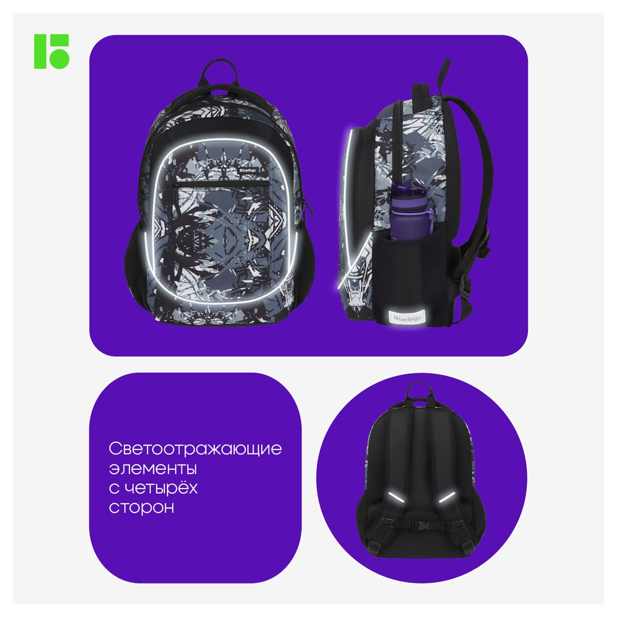В рюкзаке предусмотрены 2 отделения и 3 кармана. Внутри имеется 1 карман на резинке, 1 карман на молнии, 1 открытый карман и 1 карман из сетки на молнии. Эргономичная вентилируемая спинка, широкие регулируемые лямки и нагрудное крепление обеспечивают равномерное распределение нагрузки на позвоночник, а усиленное дно, плотная ручка для переноски и ручка-петля делают рюкзак максимально удобным. Световозвращающие элементы помогают обеспечить безопасность ребенка в темное время суток.