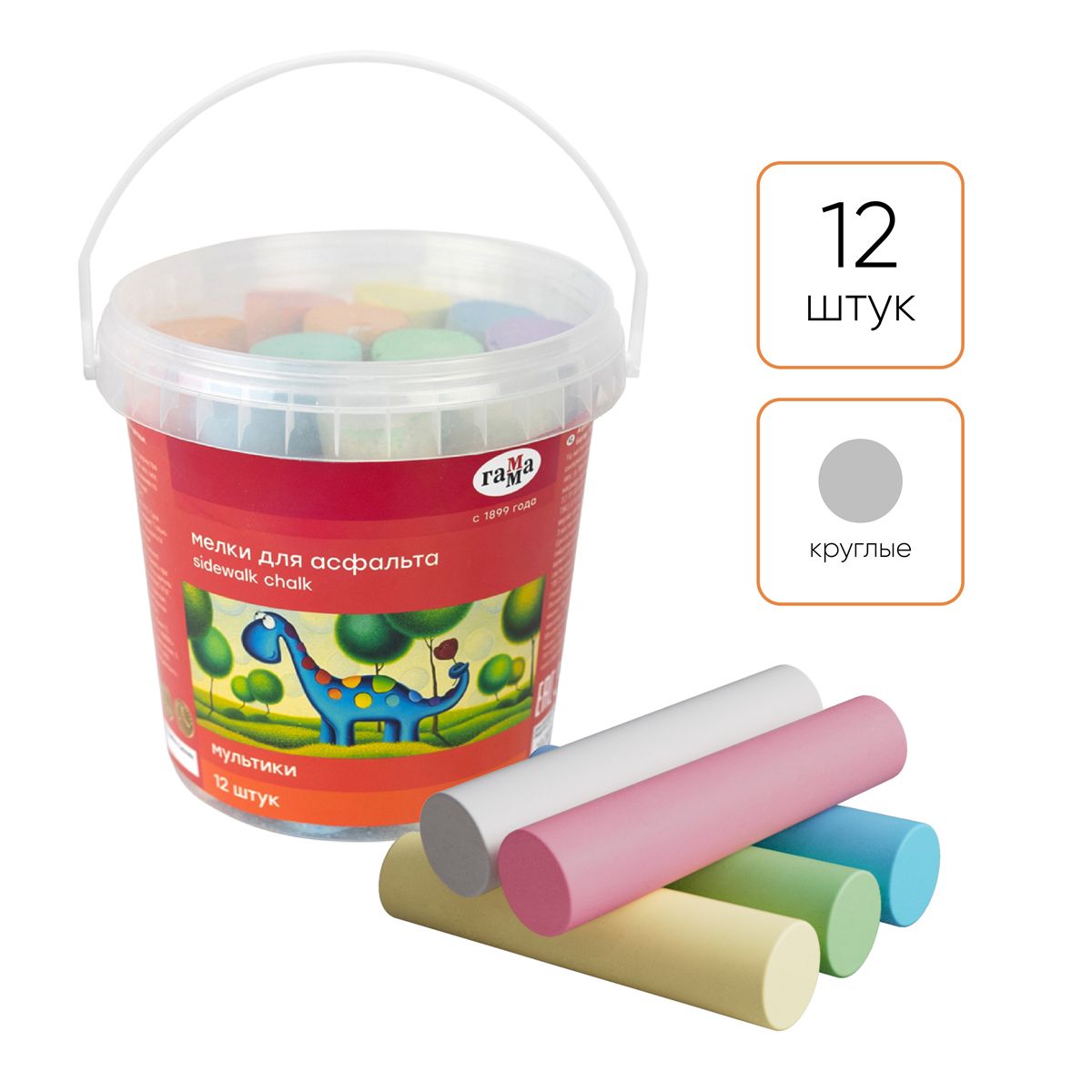 Мелки для асфальта Гамма "Мультики" цветные 12шт., круглые, пластиковое ведро NEW