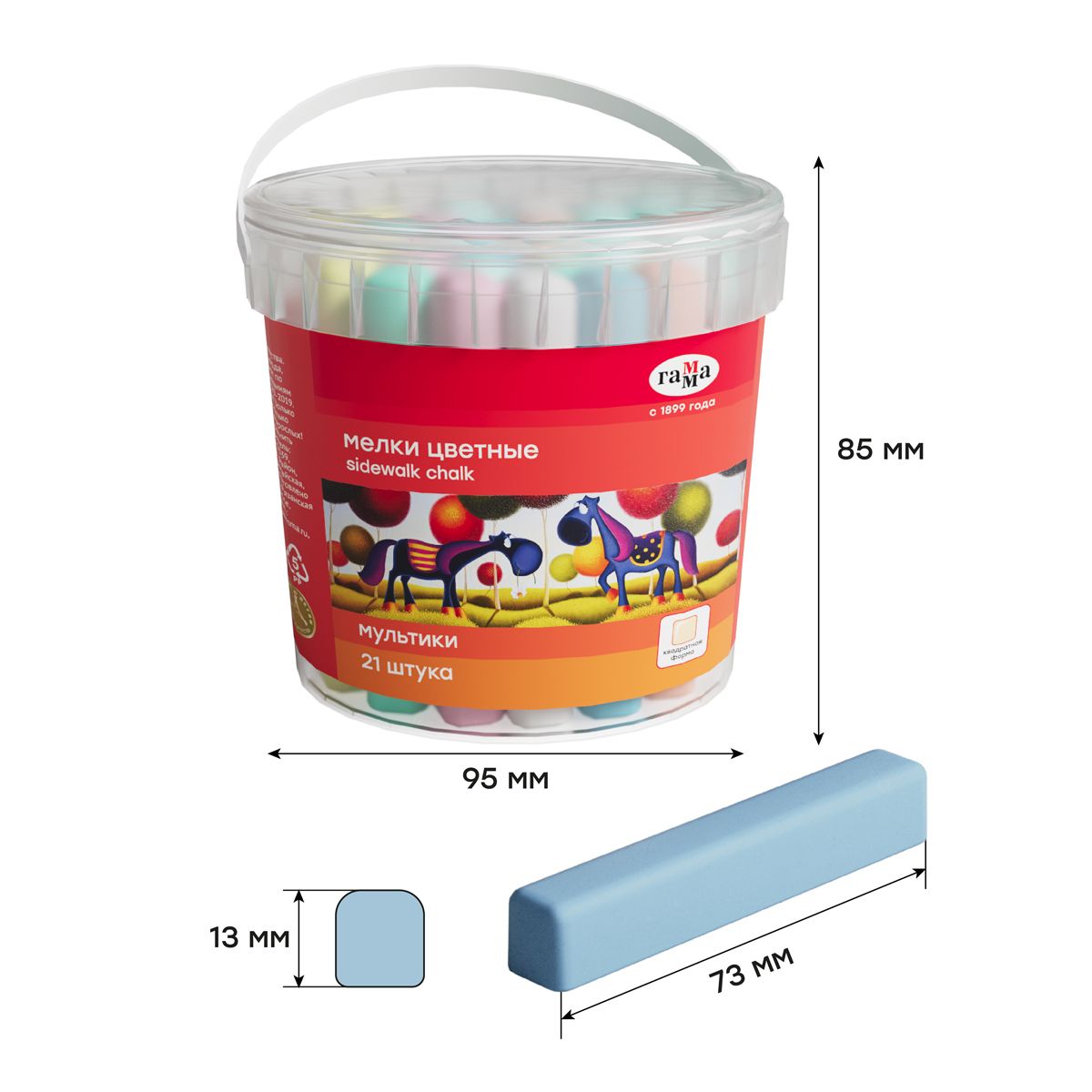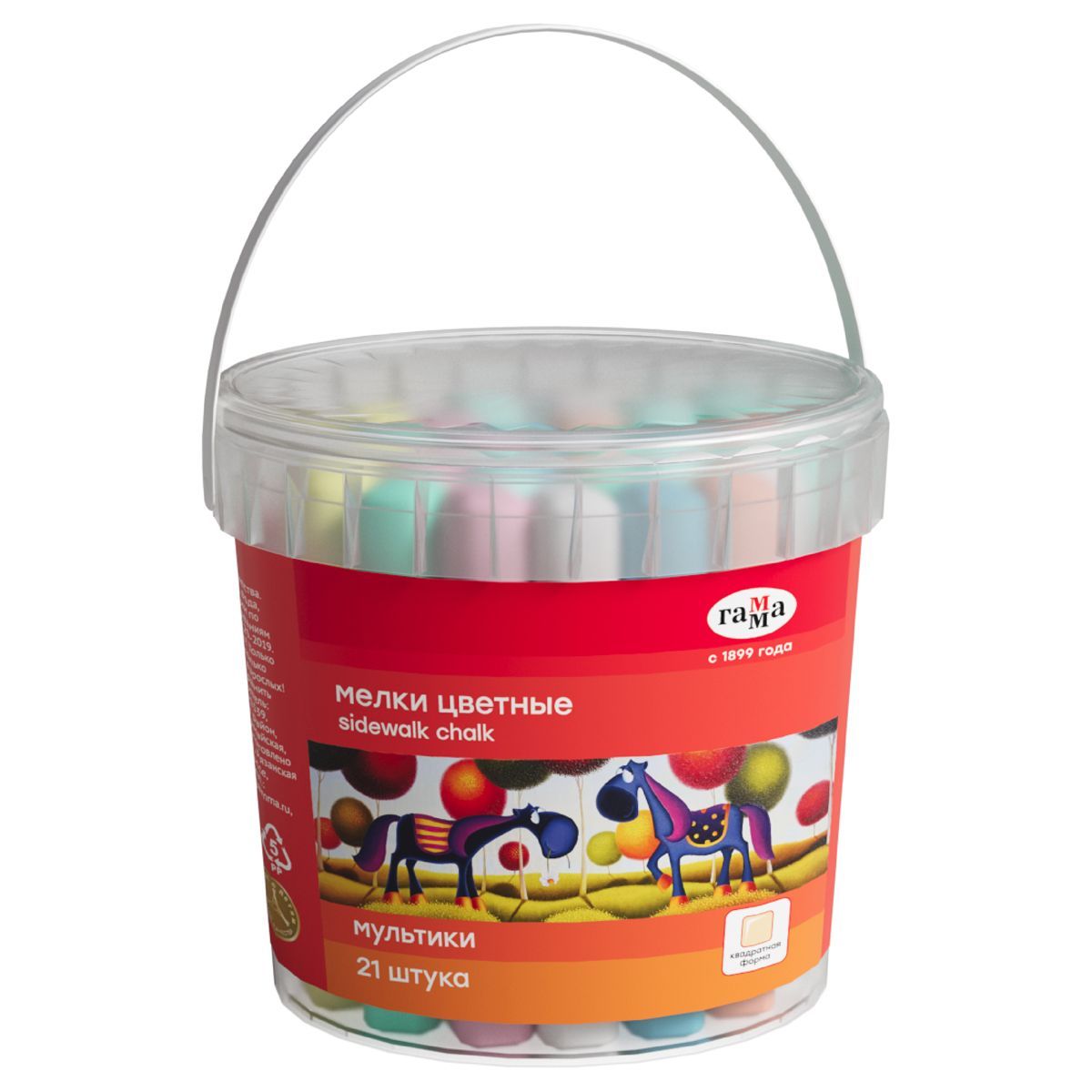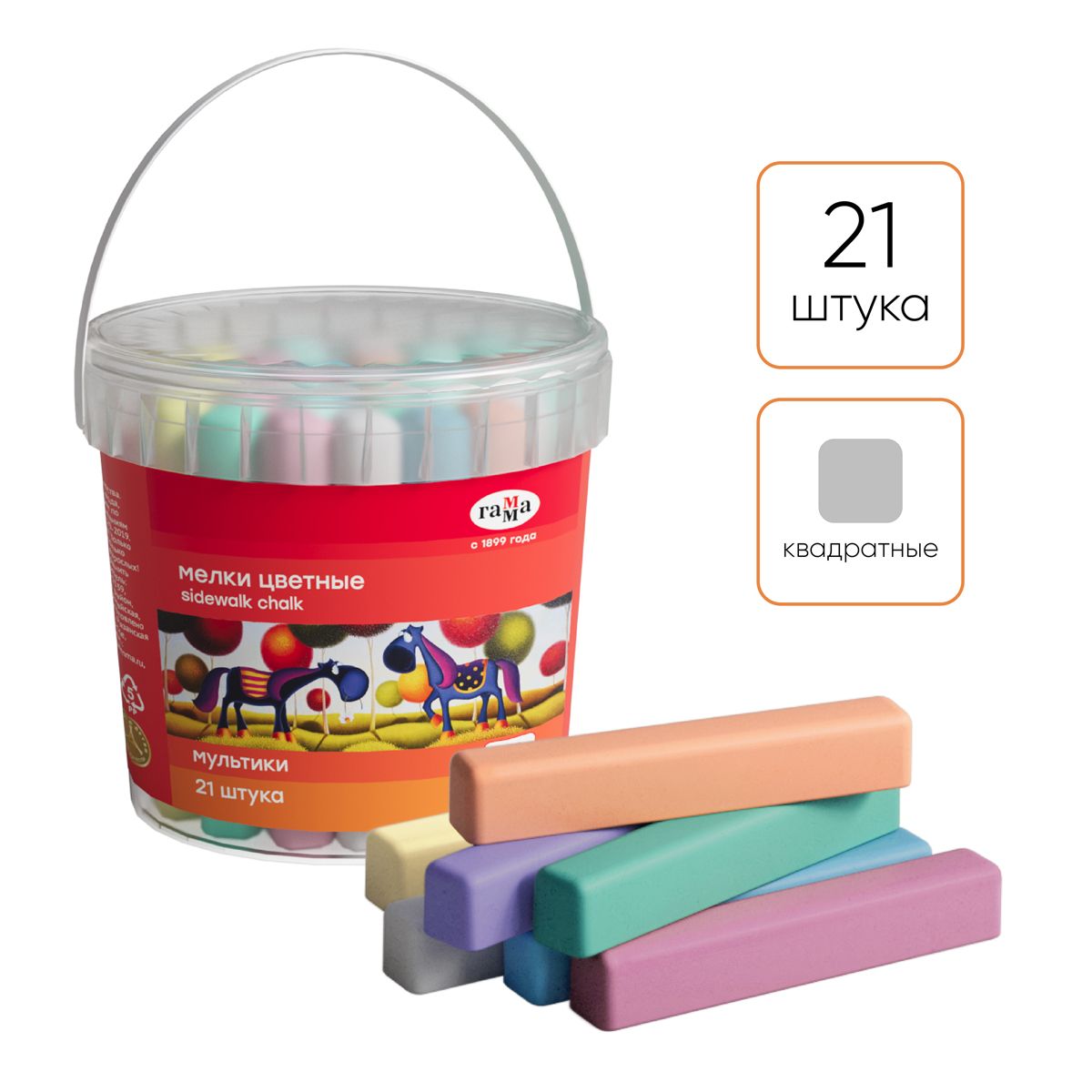 Мелки для асфальта Гамма "Мультики", цветные, 21шт., 7цв., квадратные, пластиковое ведро