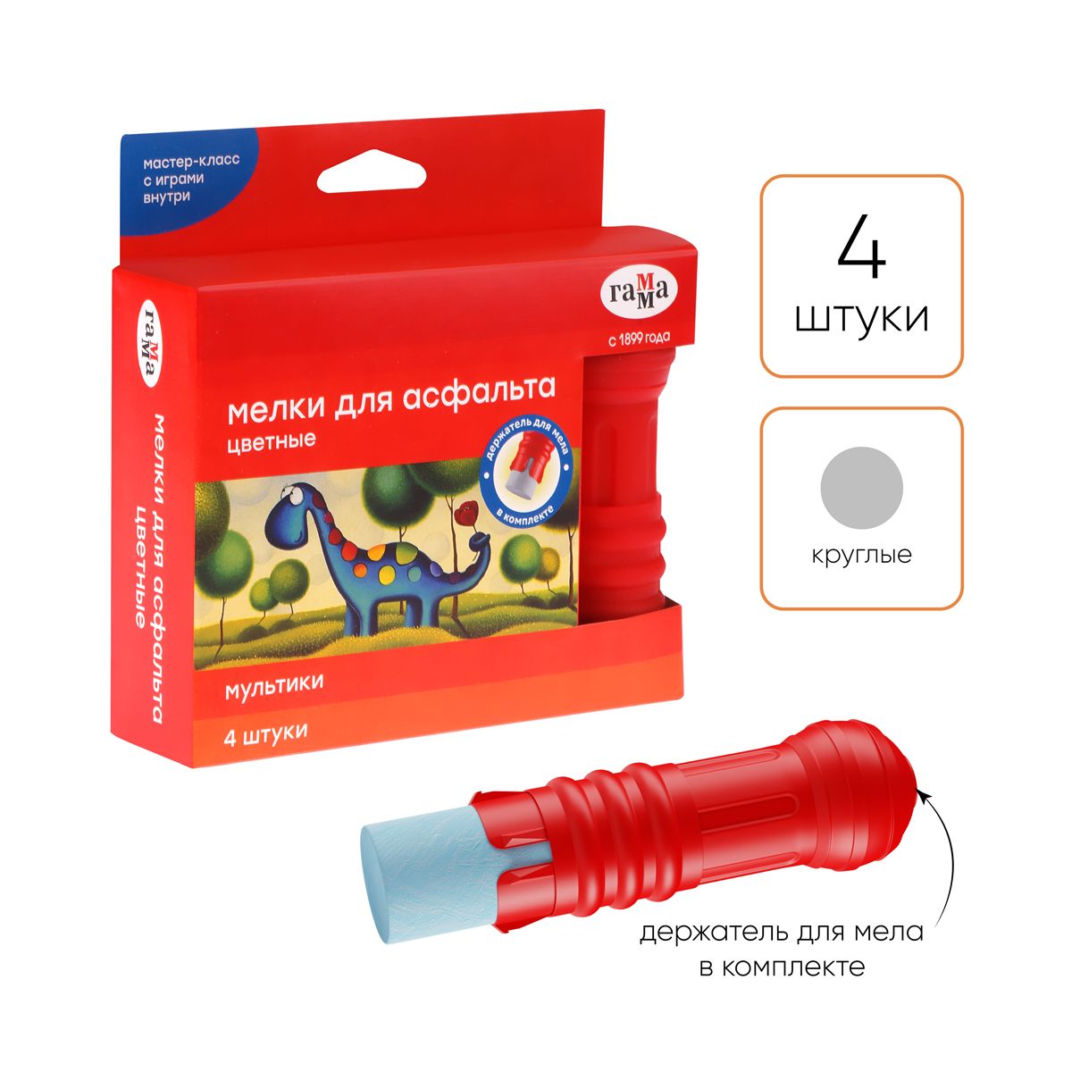 Мелки для асфальта Гамма "Мультики" цветные 4шт., круглые, с держателем, картонная коробка