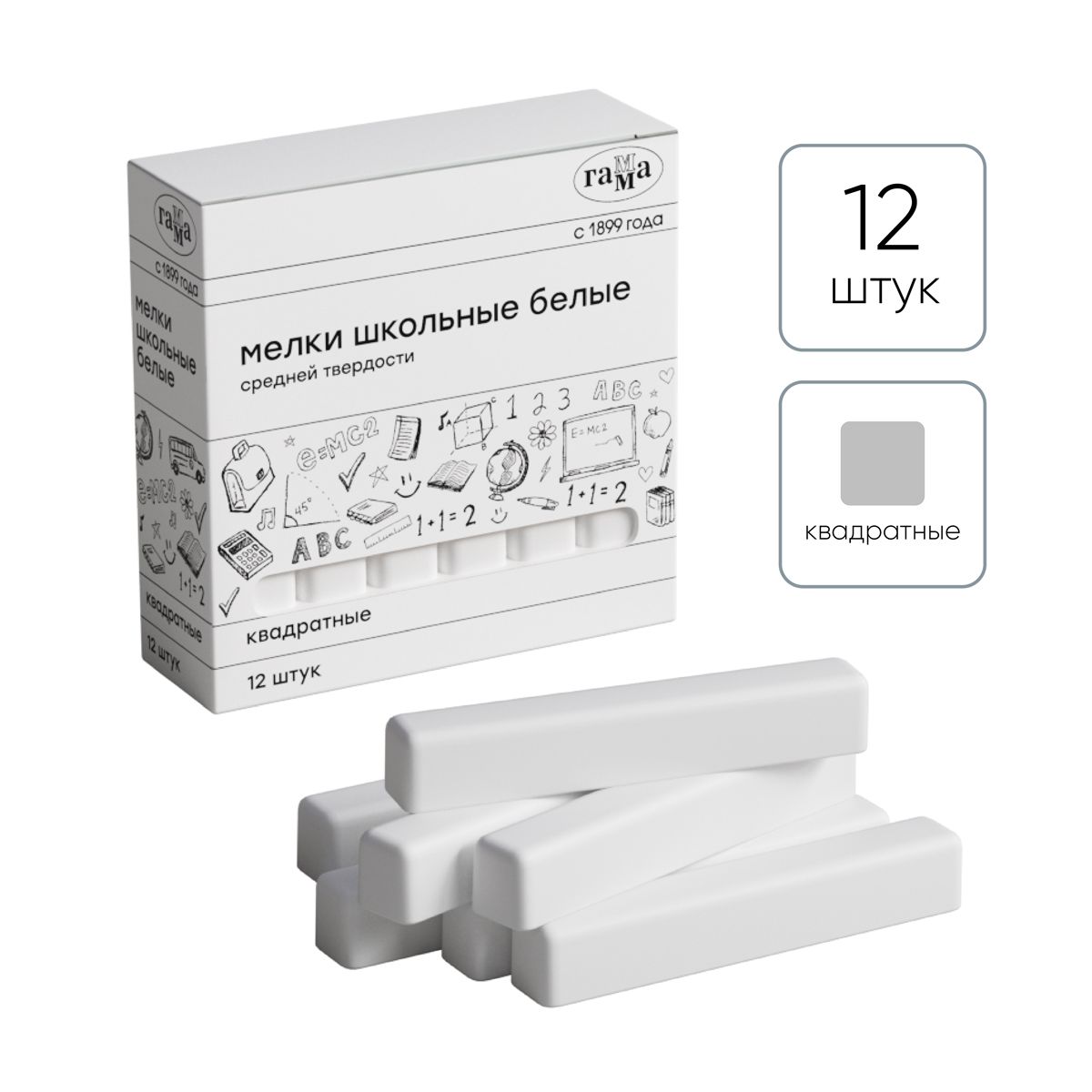 Мелки школьные Гамма, белые, 12шт., средней твердости, квадратные, картонная коробка