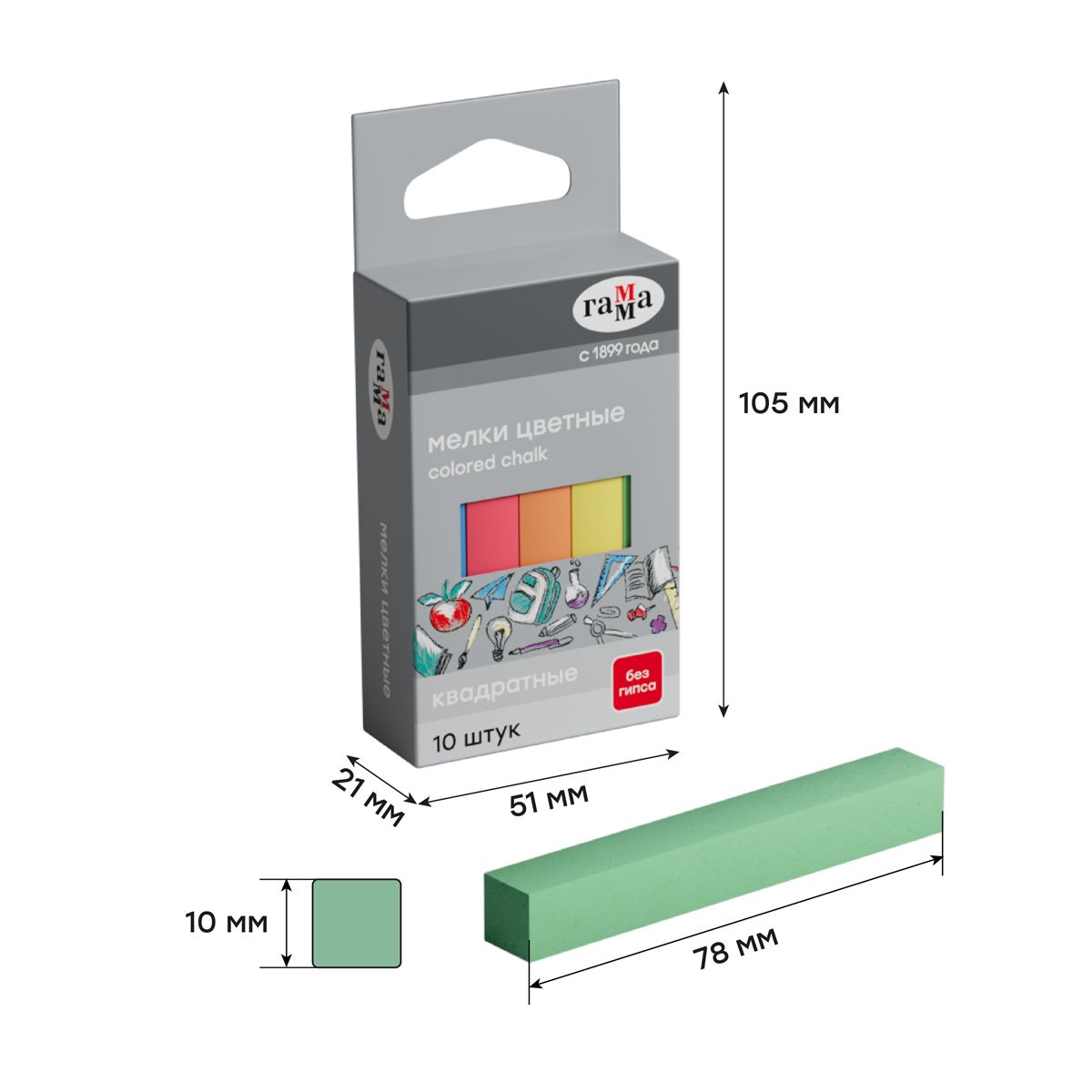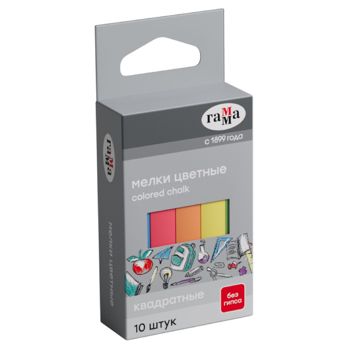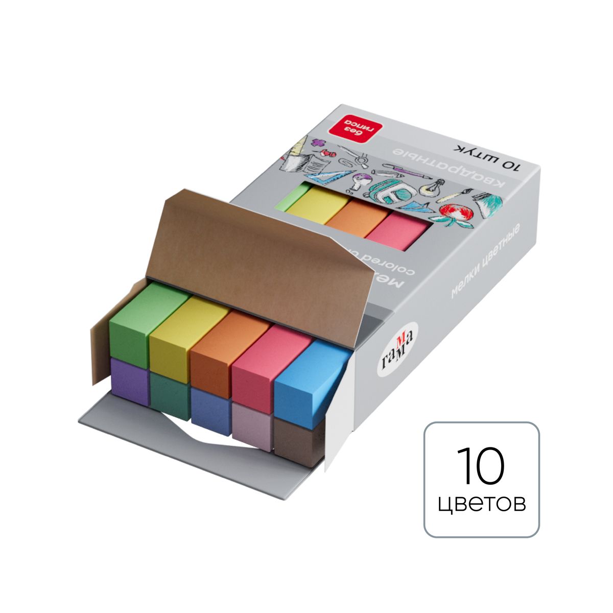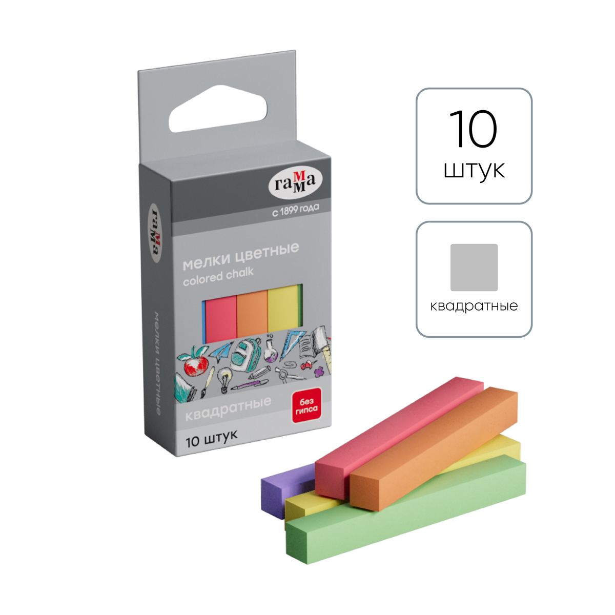 Мелки школьные Гамма, цветные, 10шт., мягкие, квадратные, картонная упаковка, европодвес