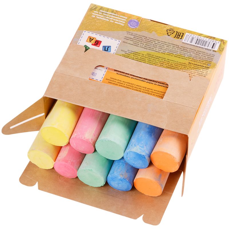 Удобная форма и мягкое письмо. Натуральный состав на основе мела, гипса, воды и пигментов, без выраженного запаха. Мелки нетоксичные. Средняя твёрдость. Следы мелков легко счищаются с рук. Набор упакован в картонную коробку. Предназначен для детей старше 3-х лет.