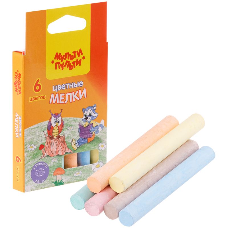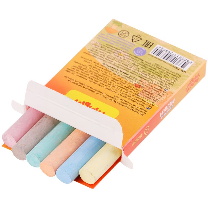 Удобная форма и мягкое письмо. Натуральный состав на основе мела, гипса, воды и пигментов, без выраженного запаха. Мелки нетоксичные. Средняя твёрдость. Следы мелков легко счищаются с рук. Набор упакован в картонную коробку с европодвесом. Предназначен для детей старше 3-х лет.