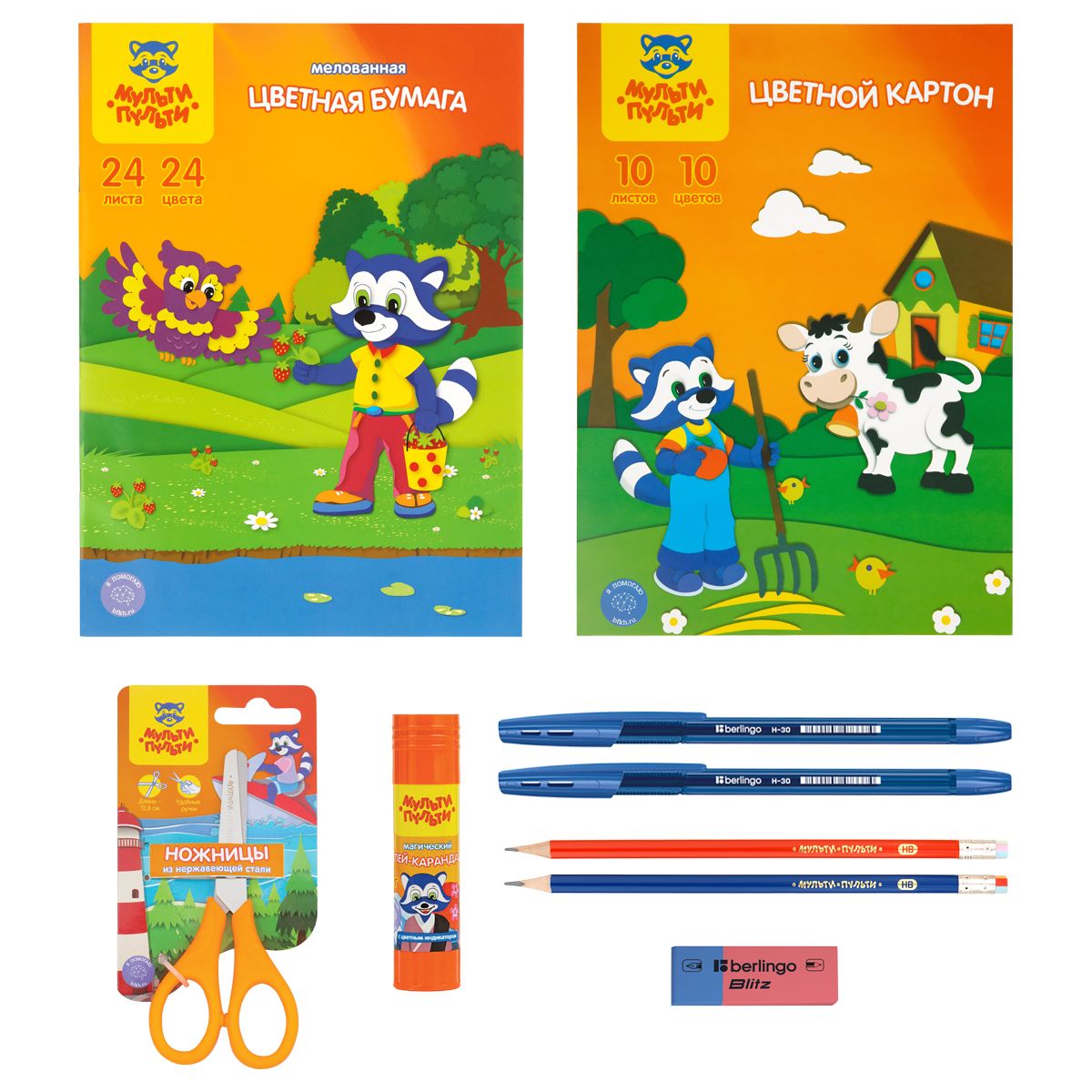 В состав набора вошли лучшие продукты Мульти-Пульти: акварель – 1 шт, альбом для рисования – 1 шт, цветная бумага А4 – 1 шт, цветной картон А4 – 1 шт, гуашь – 1 шт, доска для лепки – 1 шт, карандаш чернографитный – 2 шт, карандаши цветные – 1 шт, клей-карандаш – 1 шт, ластик – 1 шт, линейка – 1 шт, ножницы – 1 шт, пластилин – 1 шт, ручка шариковая - 2шт, тетрадь, клетка – 5 шт,