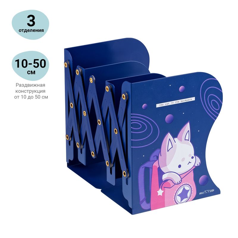 Подставка для книг MESHU "Space Cat", 3 отделения, раздвижная