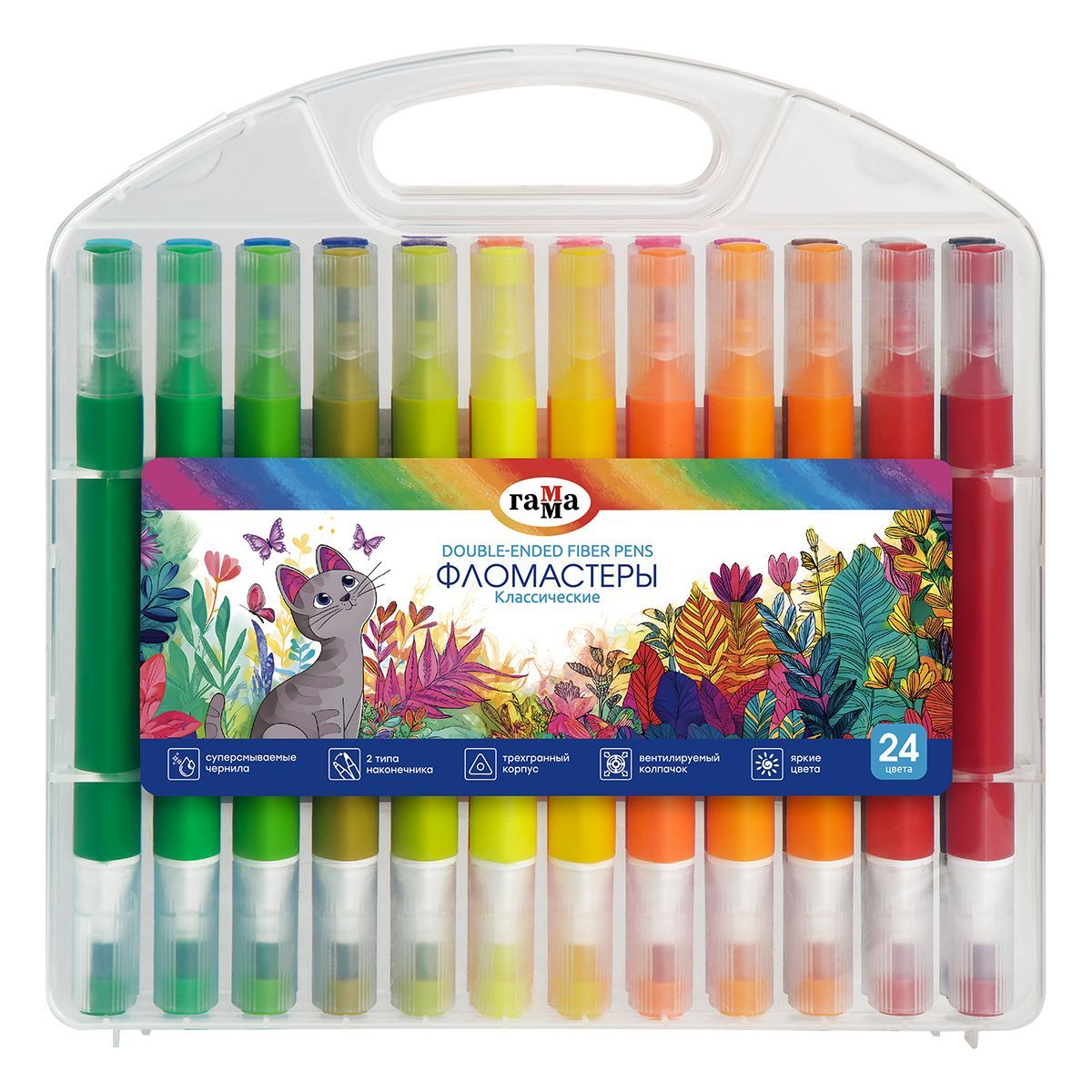 Фломастеры двусторонние Гамма "Классические", 24цв., суперсмываемые, пластик.бокс, т/у