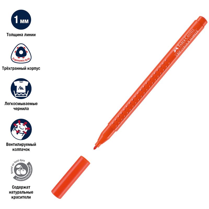 Фломастеры Faber-Castell Grip представлены с удобным трехгранным корпусом и запатентованной формой захвата. Подходят для рисования левой и правой рукой. Чернила производятся на основе пищевых красителей и смываются с большинства тканей. Фломастеры представлены с конической формой наконечника.