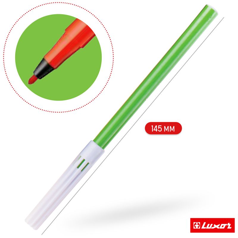 Фломастеры Luxor Coloring специально предназначены для детей от 3-х лет. Они имеют специальное строение пишущего узла, который при сильном нажатии не деформируется и не вдавливается. Пластиковый ложемент предотвращает беспорядок и помогает даже самому маленькому ребенку собрать аккуратно фломастеры в упаковку. Чернила на водной основе легко отстирываются с одежды и смываются с рук водой. Фломастеры Luxor Coloring представлены с круглой формой корпуса и безопасным вентилируемым колпачком.