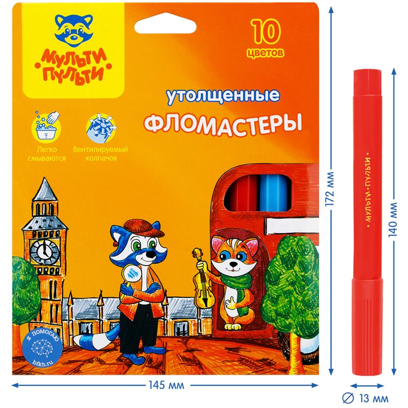Фломастеры Мульти-Пульти "Енот в Англии", 10цв., утолщенные, смываемые, картон, европодвес