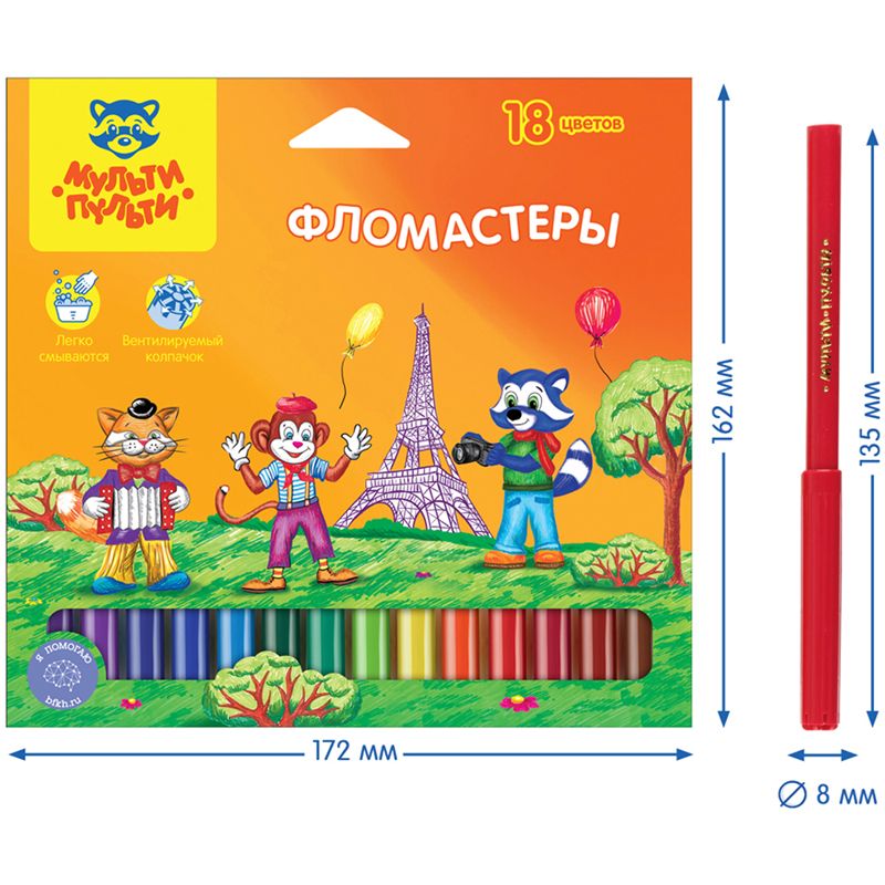 Фломастеры Мульти-Пульти "Енот во Франции", 18цв., смываемые, картон, европодвес